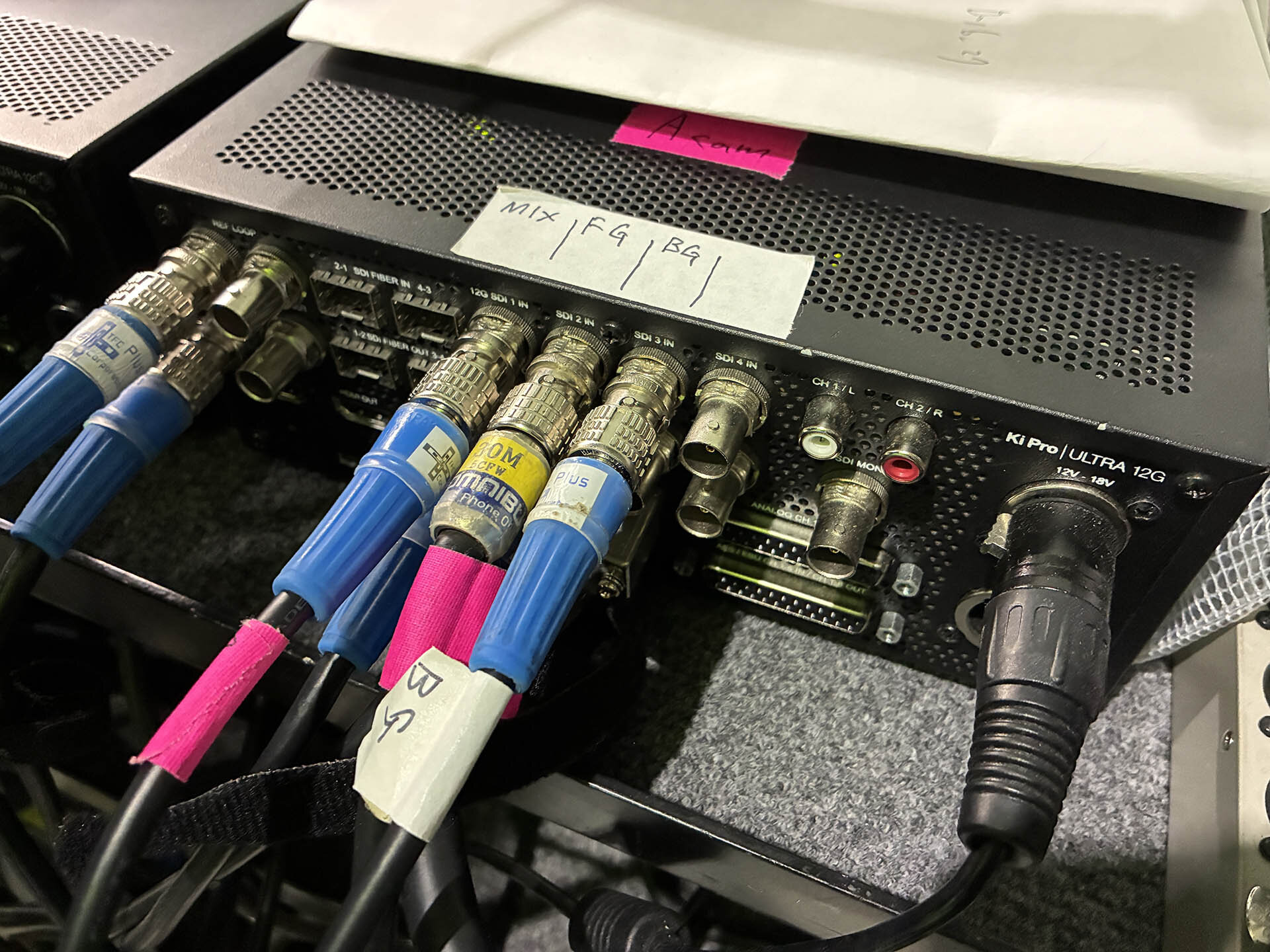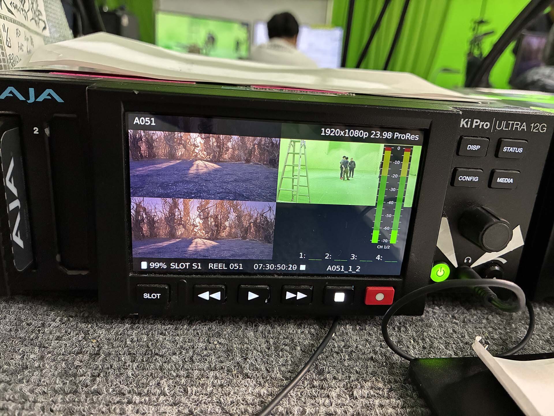 GB方式のため、現場での簡易合成や収録データの取り扱いのしやすさにも配慮。収録システムには、AJA「Ki Pro Ultra 12G」を採用。HD解像度であれば最大4チャンネル同時収録が可能な特性を活かして、現場でのリアルタイム合成映像、グリーンバックのみ(フォアグラウンド)、背景のみ(バックグラウンド)という3つのソースが同時収録された(※オリジナル5Kの撮影データは別途保管)。