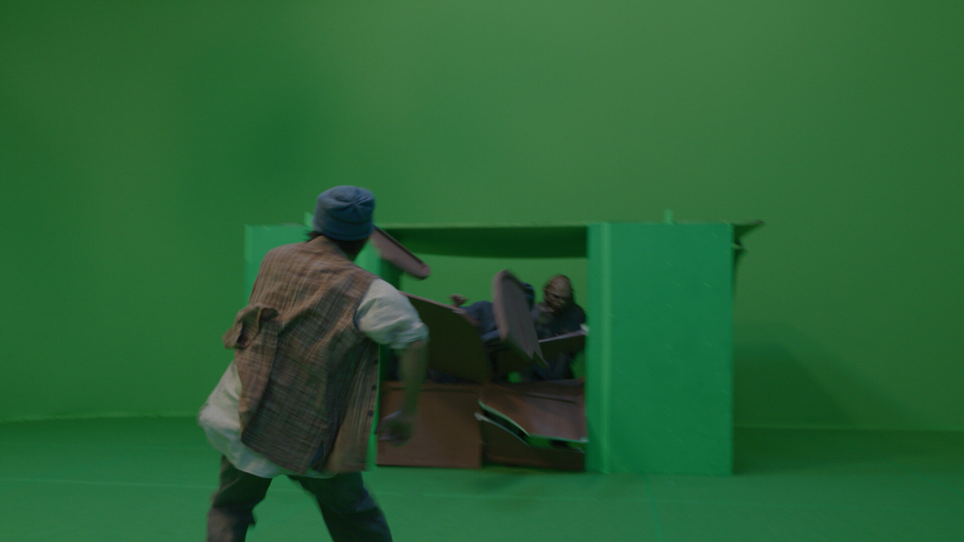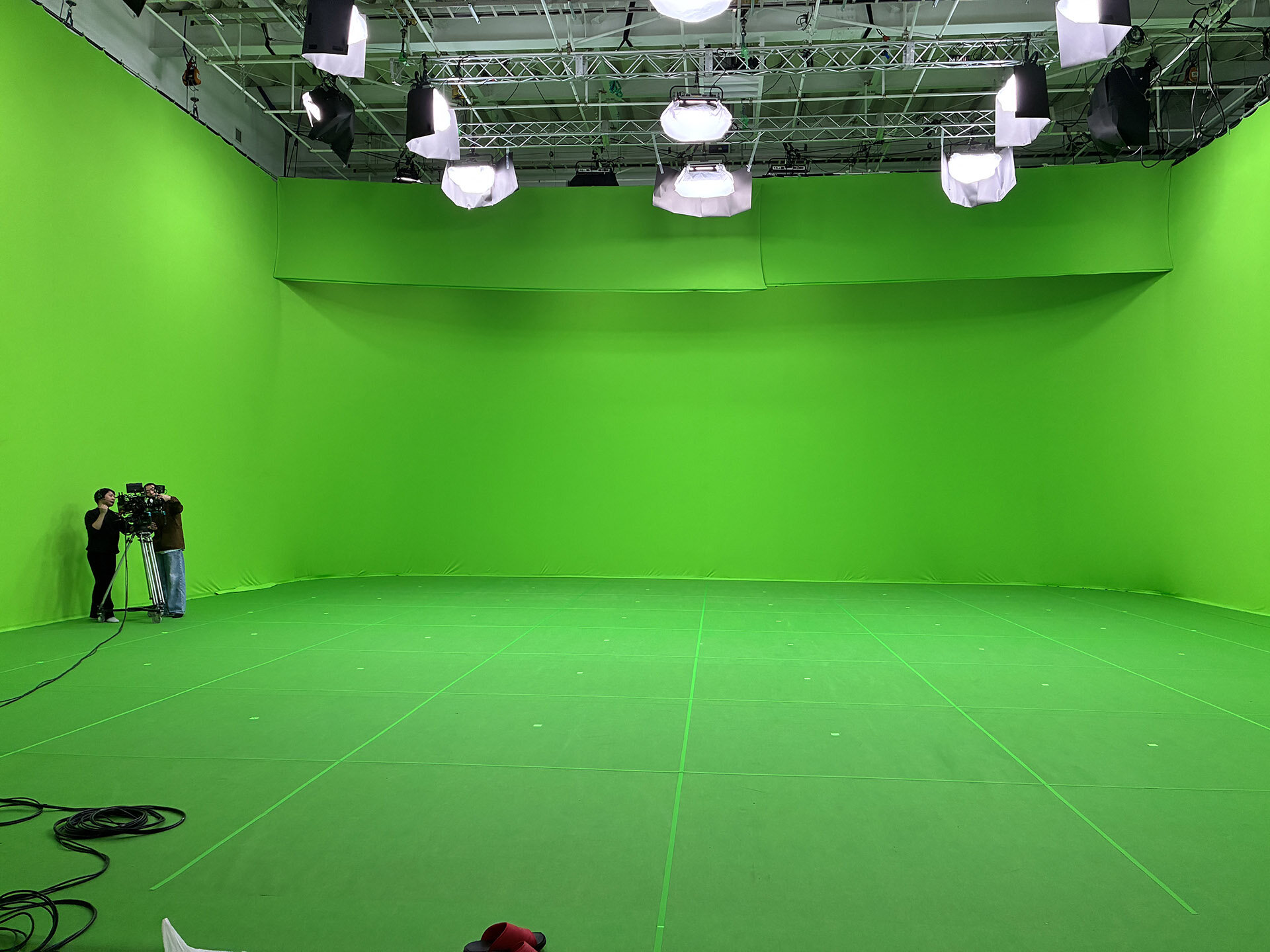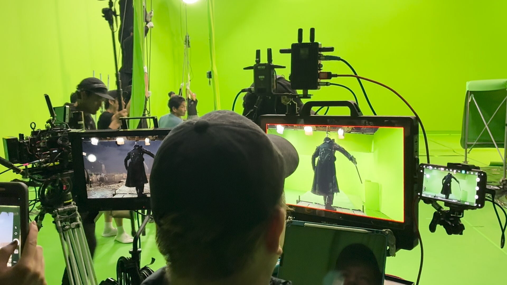 「LED方式では、LEDにピントを合わせると撮り方によってはモアレが発生する恐れがあります。さらに特撮アクションでは自由なカメラワークが理想なので、自ずとLEDウォールの範囲以上の画角が発生します。加えてリアルカメラの挙動とバーチャル背景とのレイテンシーがたとえわずかでも発生することも避けるにはGB方式が望ましいと考えました」(鹿角氏)。
