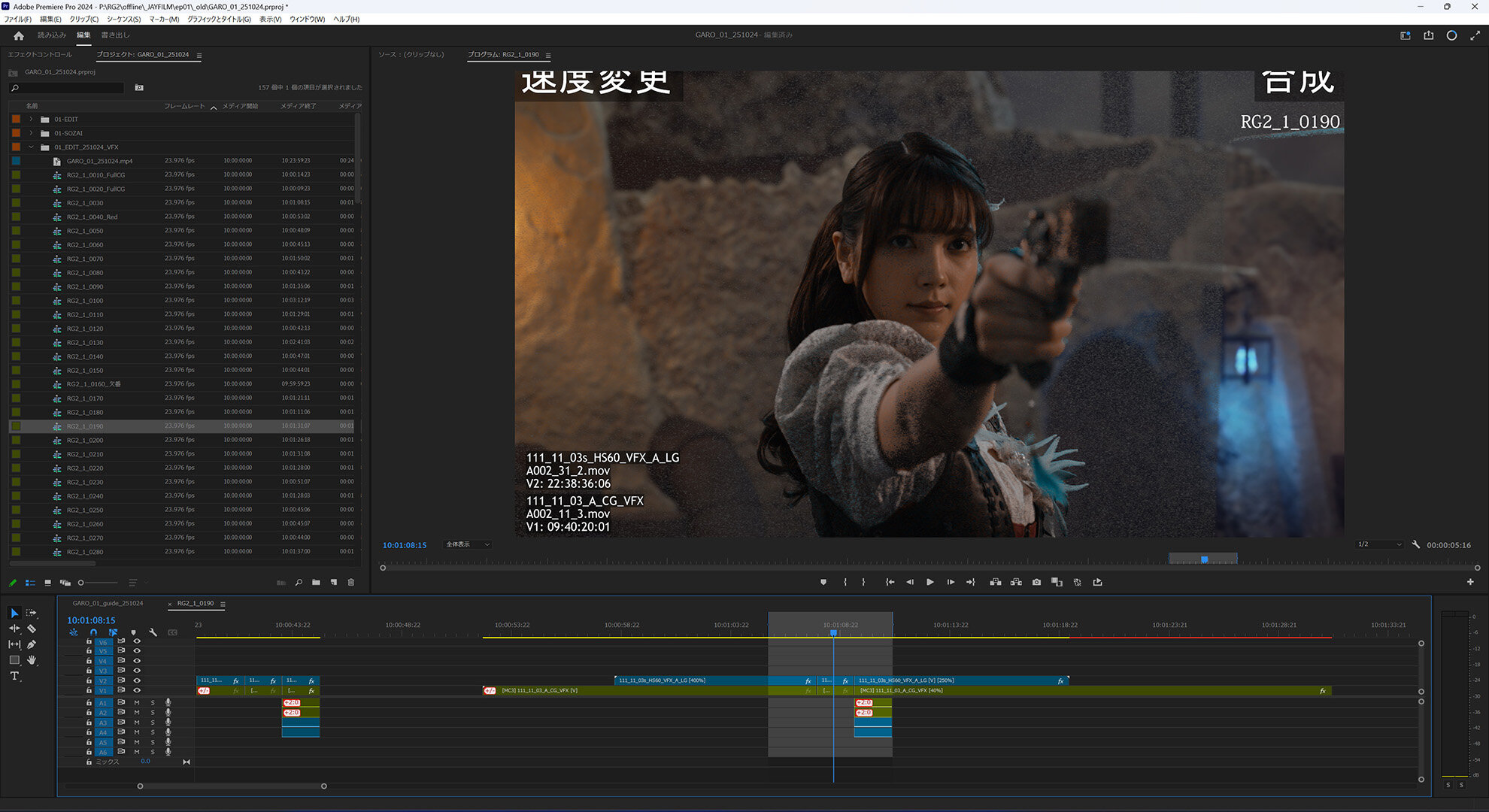 アクションシーンでは、60コマや120コマのハイスピード撮影も不可欠だが、背景の品質とPCの能力的にハイスピード収録は難しいため、現場では24Pで収録&リアルタイム合成をしつつ、カメラ本体ではハイスピード収録を行い、撮影後に技術チームがハイスピード素材を書き出し、編集段階で24P素材をストレッチした箇所にハイスピード素材を差し替えるという運用が採られた(※オフライン用の素材はDITチームが収録)。