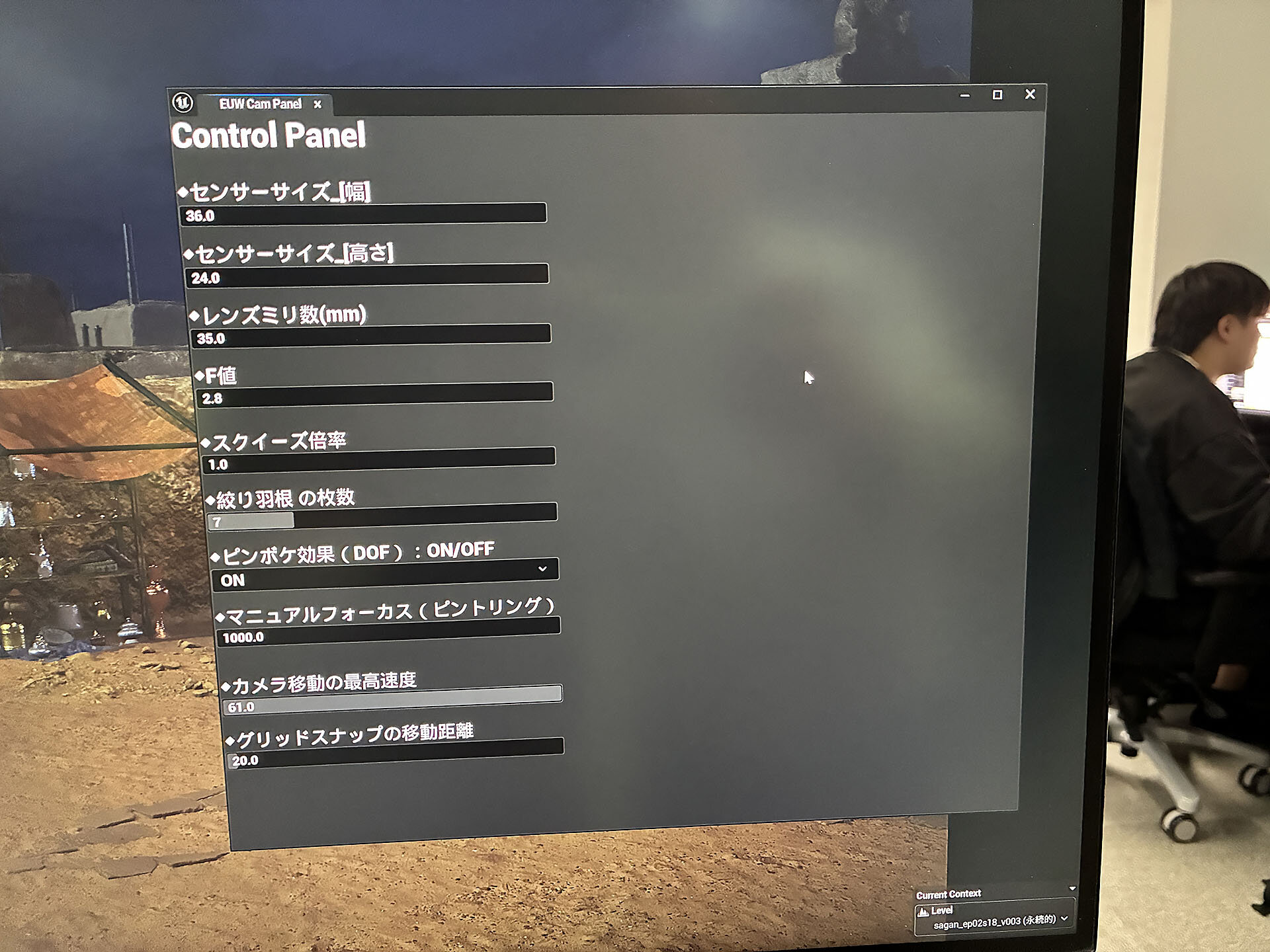 ▲ カメラ設定のUI。センサーサイズ、レンズミリ数、F値など本番撮影に使われたREDなどのリアルカメラのスペックを設定できる