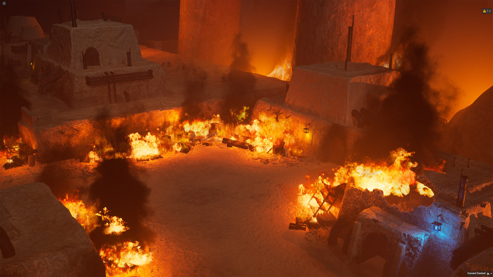 ▲ 街が火災に襲われるシーンでは、Flipbookテクスチャを利用することで迫力ある火災描写を生み出した。「VPに必要なfpsを確保する必要があるので、常にシーンへの負荷を考慮しながら画づくりを行なっています。この火災シーンでは、炎アニメーションの連番素材をFlipbookテクスチャに割り当てたものを多数配置していますが、UEではfpsをしっかりキープしてくれたのでそのリアルタイム性能に改めて感心しました」(中屋氏)