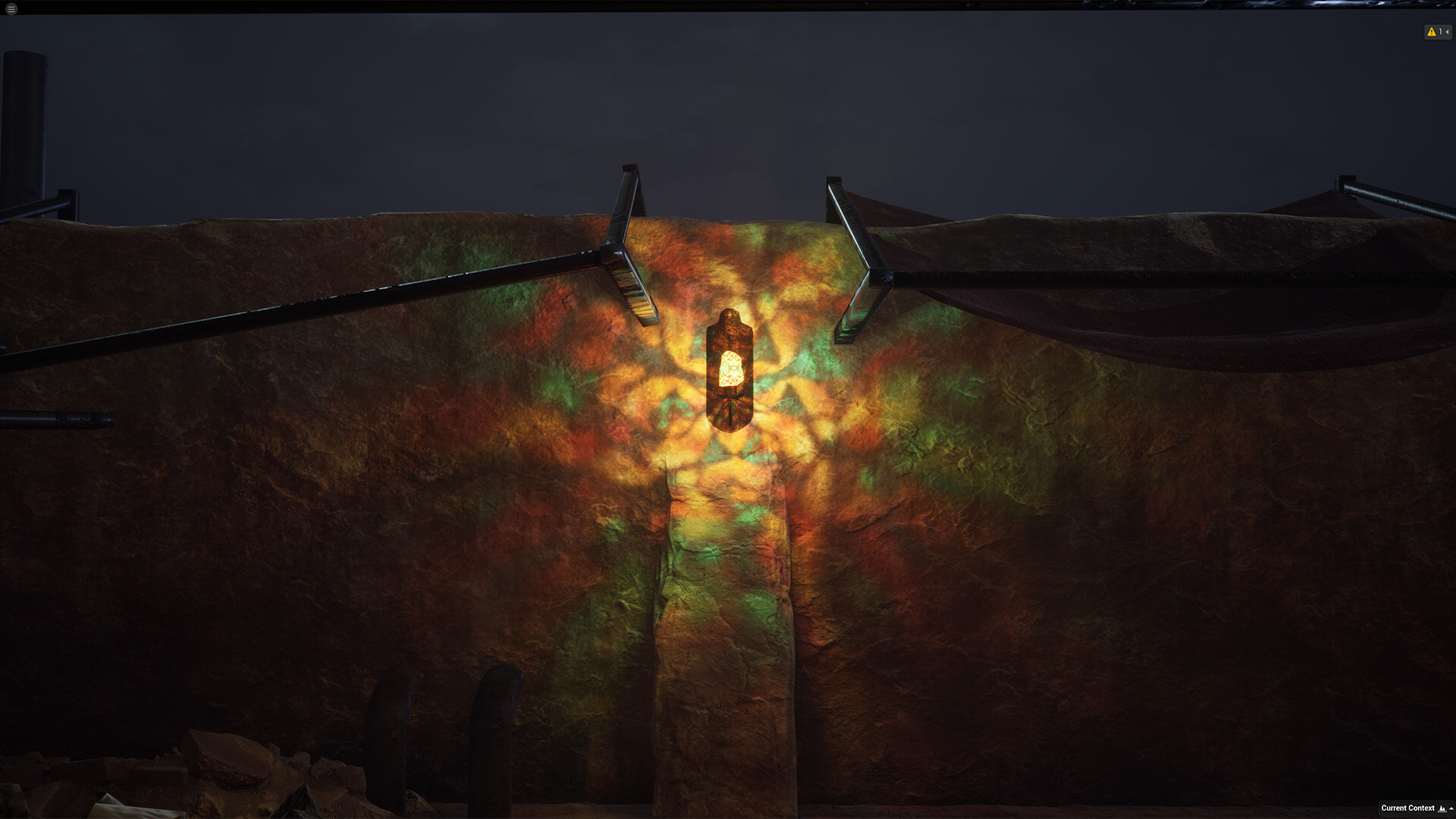 ▲ 撮影部と照明部からのリクエストを受けて、UEシーン内に配置されたランプの光源にステンドグラス状のテクスチャを組み合わせることで、リッチな照明効果を実現させた。(左図)市販素材を加工したテクスチャ素材/(右図)完成したランプ照明。本編でもぜひ注目してほしい