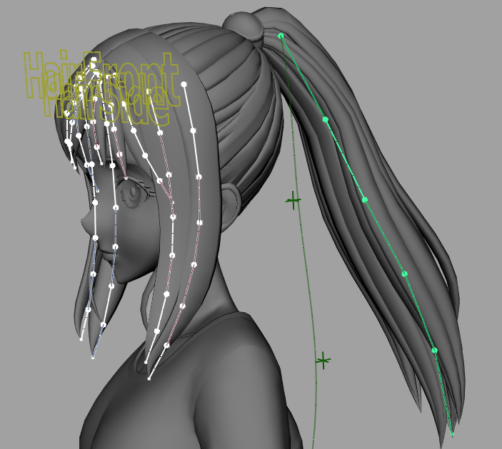 「strand」ユニットは、eSTリグを構成する骨構造プリセットのひとつで、根元が固定された1本のジョイントチェーンを基本とし、複数のチェーンを定義できます。ここでは、髪の毛にセットアップされた「strand」ユニットの既定の「standard」コントローラを使用し、簡易的にシミュレーションを行う手順を紹介します。