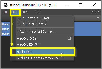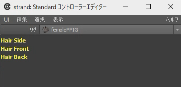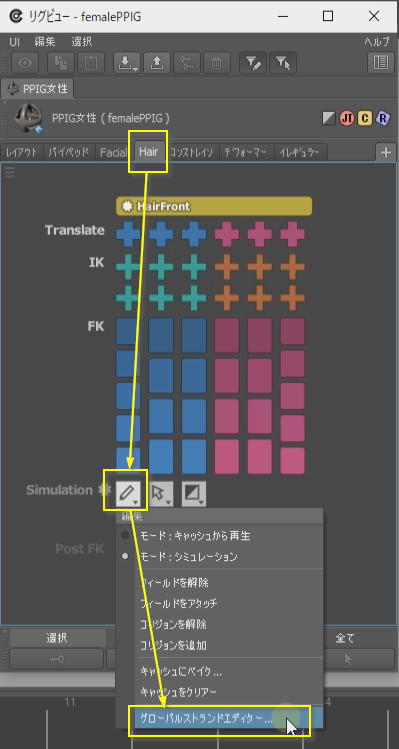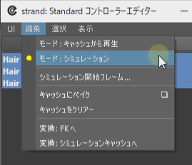 「リグビュー」の Hair タブを開き、[Simulation→グローバルストランドエディター]から「strand: Standard コントローラーエディター」を起動します。
