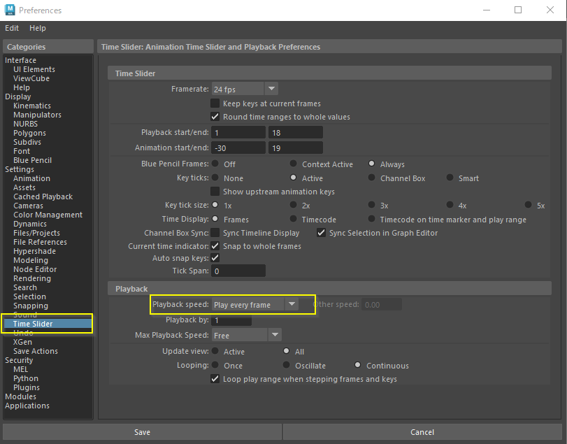 まず、シミュレーションを正確に計算させるため、Mayaの再生設定を「Play every frame」に変更します。