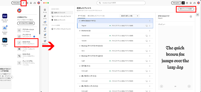 バリアブルフォントはアプリケーションのインストール時に何書体かは自動でインストールされますが、それほど数は多くないため、お好みのバリアブルフォントを追加する場合は、Adobe Fontと同期します。Adobe Creative Cloudアプリを起動し、ホームから「Adobe Font」または「f」のアイコンをクリックした後、「別のフォントを探す」をクリックし、Adobe Fontのサイトに入ります。