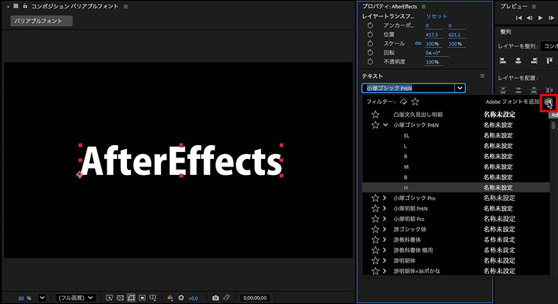 After Effects側から直接追加する場合は、何らかのテキストを入力した後、プロパティパネルのテキストにあるフォントから、Adobe Creative Cloudのアイコンをクリックすると、Adobe Fontのサイトに入ることができます。