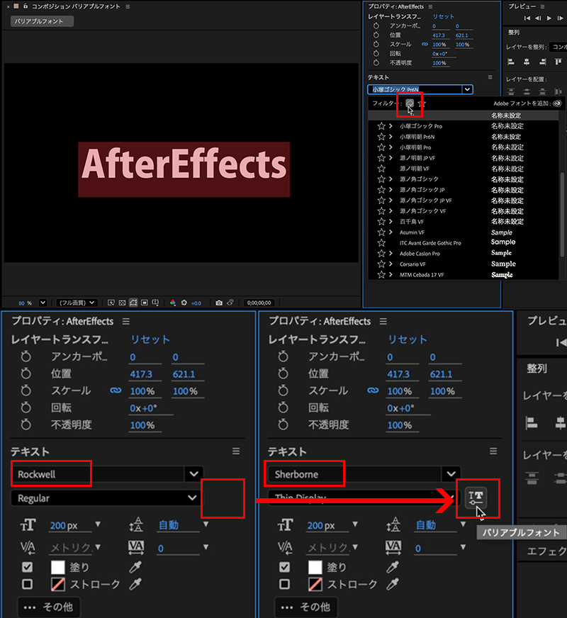 インストール後、After Effects側でバリアブルフォントを探す場合は、プロパティパネルのテキストにあるフォントから、[Adobeからのフォントを表示](雲にレ点のアイコン)をクリックします。すると、Adobe Fontと同期したフォントが表示され、フォント名の最後に「VF」が付いているフォントがバリアブルフォントになります。