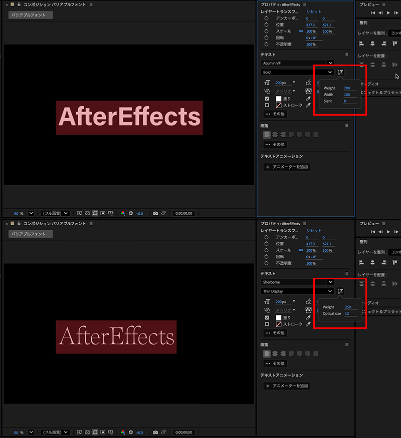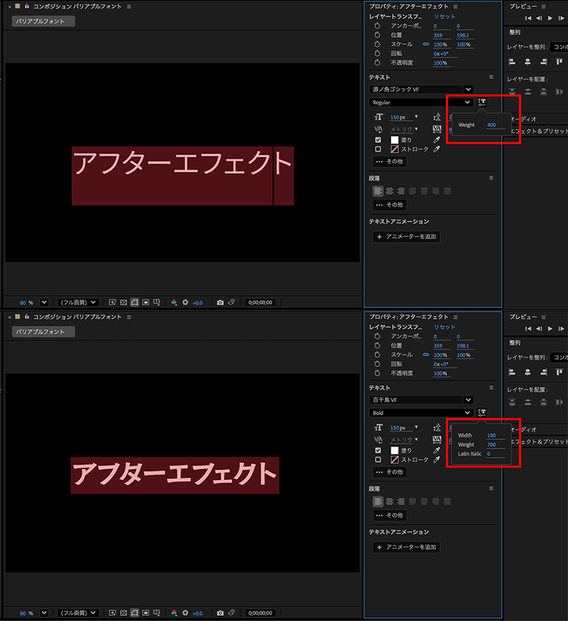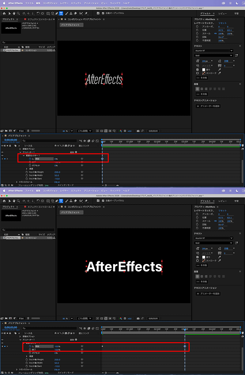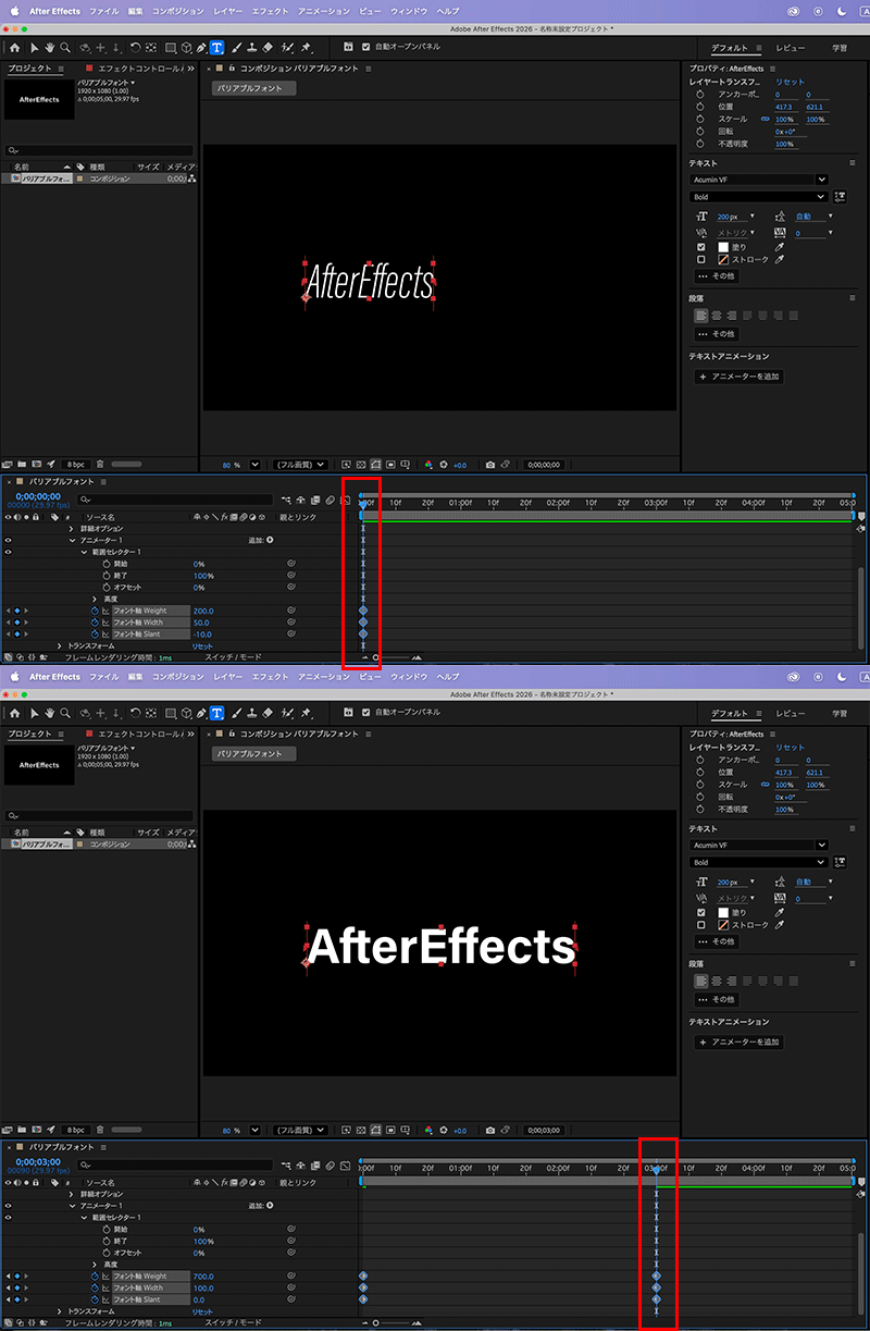 ・「フォント幅Weight」:0秒目に200、3秒目で700
