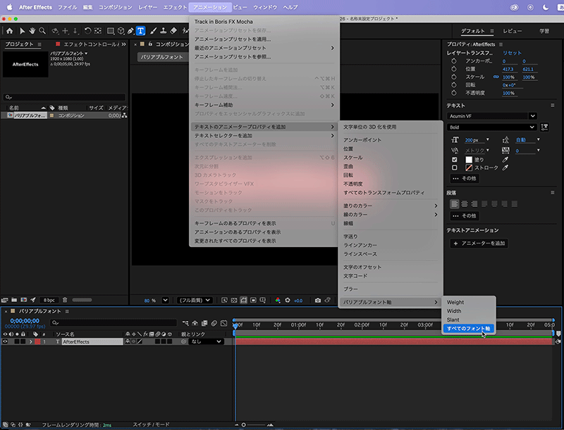 まずは任意の文字列を入力し、フォントをAcumin VFのBoldにしておきます。テキストを選択した状態で、[アニメーションメニュー>テキストのアニメータープロパティを追加>バリアブルフォント軸>すべてのフォント軸]を選択します。