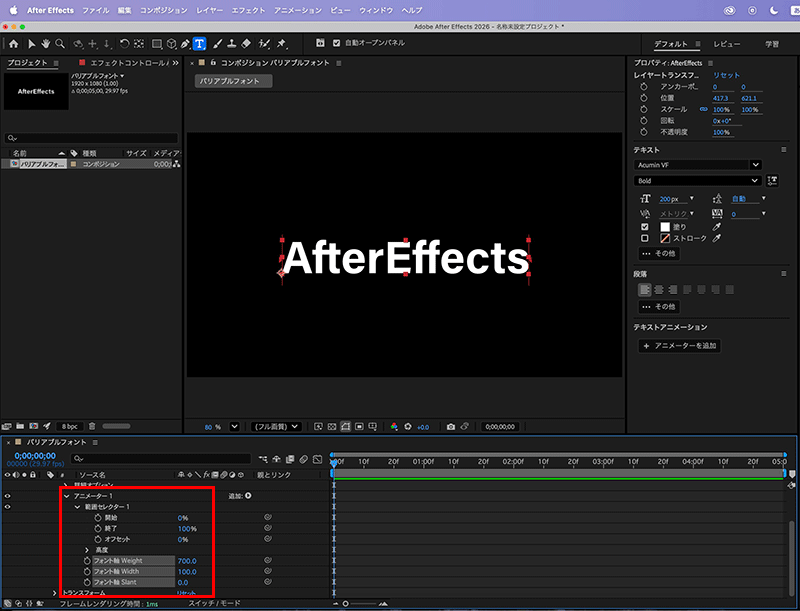 バリアブルフォントにアニメーションを加える場合は、アニメータープロパティから追加します。例えば、Acumin VFの場合、「Weight」「Width」「Slant」の調整が可能ですが、このうちのいずれか、または全部に対してアニメーションを適用することが可能です。