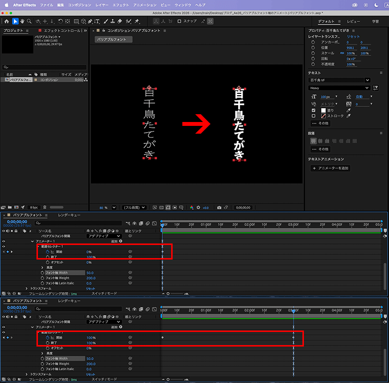 ・「フォント幅Width」:0秒目に50、3秒目で100