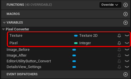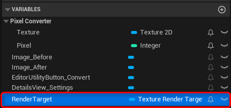 「Texture」と「Pixel」という変数を追加し、さらに「Pixel Converter」というカテゴリを追加します。