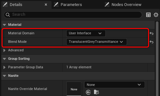 新規マテリアルアセットを作成し、[Material Domain]を「User Interface」に、[Blend Mode]を「TranslucentGreyTransmittance」に変更します。