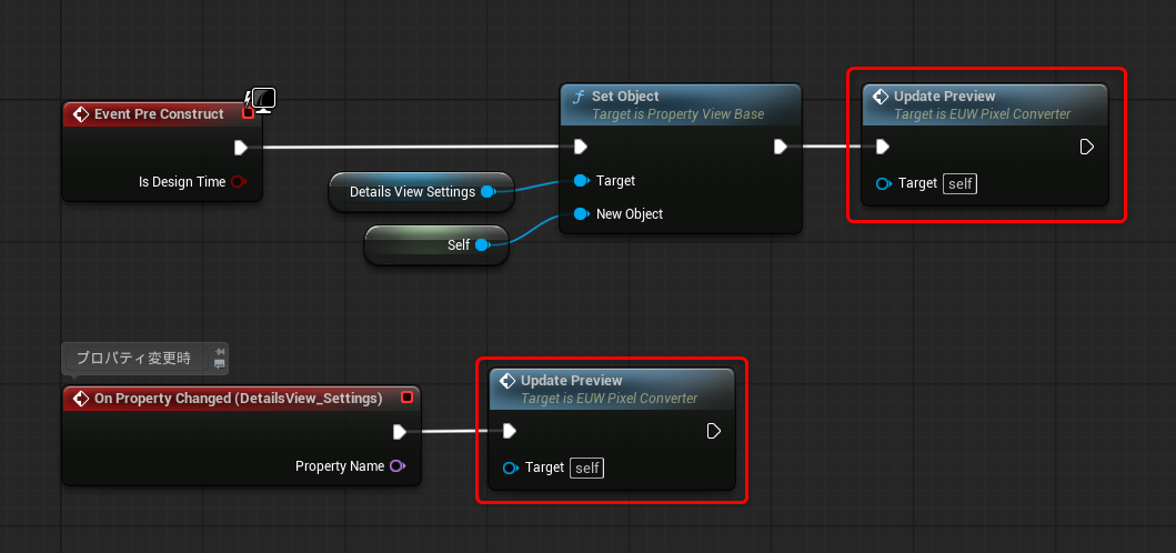 「Pre Construct」と「On Property Changed」の末尾に「Update Preview」を追加します。