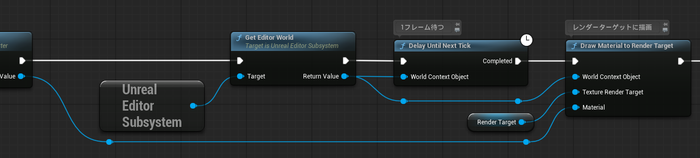 レンダーターゲットの更新を待つため、1フレーム挟んだ後、生成したDynamic Material Instanceを使ってレンダーターゲットに描画します。