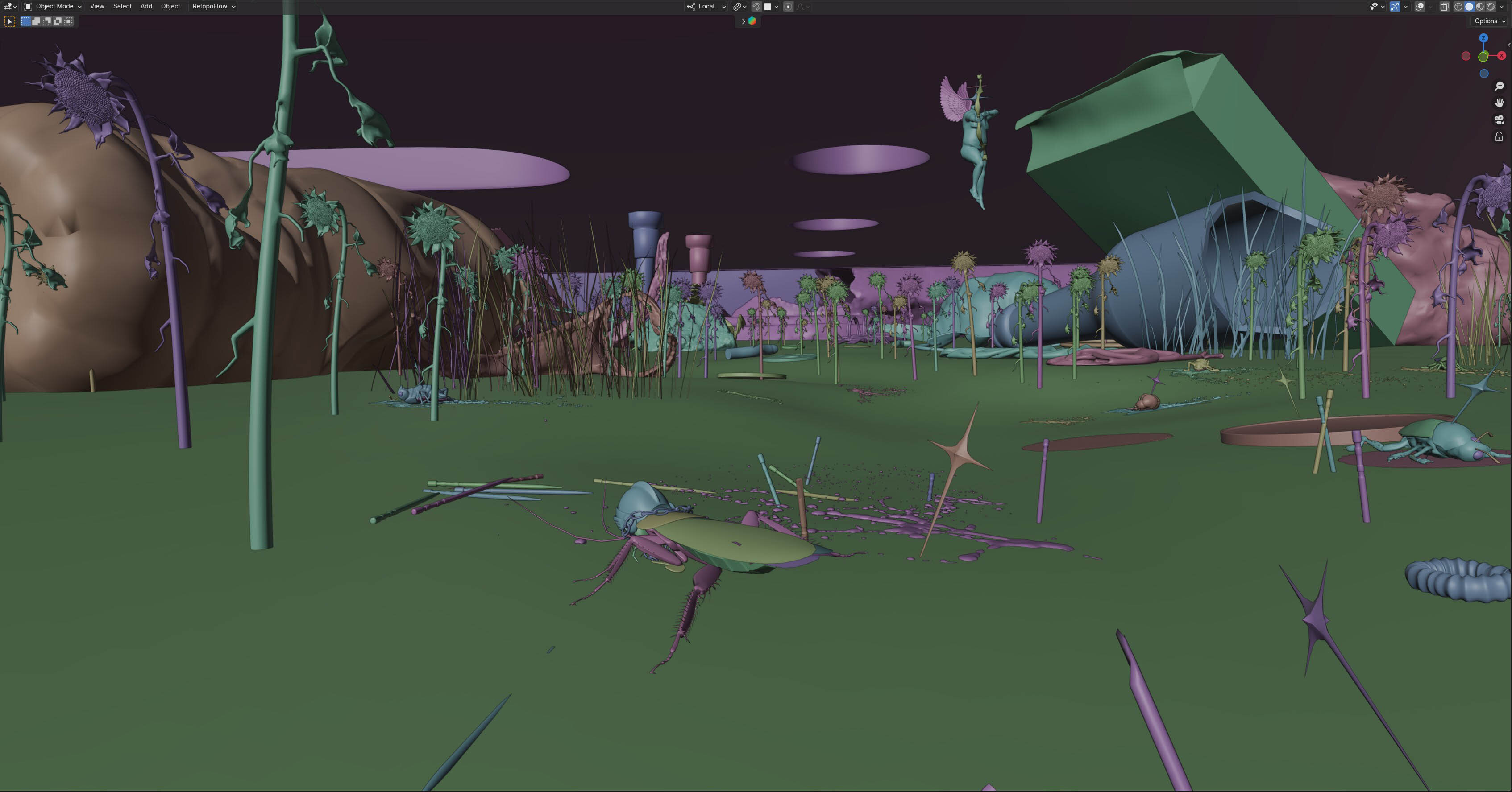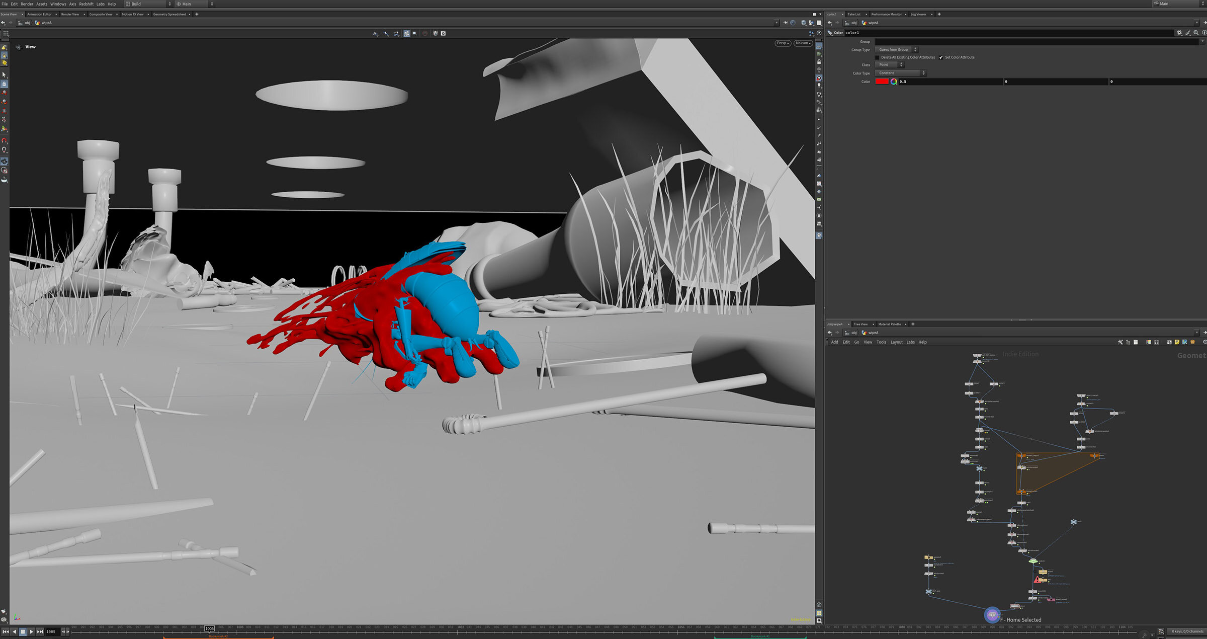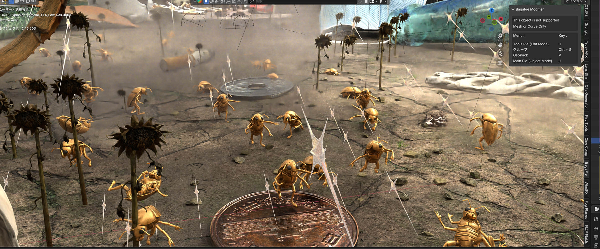 「コンポジットはNukeで行いましたが、今回のチームでNukeを扱えるのは自分ひとりだったので、かなりギリギリの制作でしたね(苦笑)。ショットワークを手伝ってくれた3名が全員BlenderユーザーだったのでBlenderをメインに使いつつ、特別なエフェクト表現にはHoudiniを利用しました。レンダラは主にCyclesを使い、ディテールをそこまで必要としないショットやボリューム表現にはEeveeも活用するなど、できるだけ効率的に作業することを心がけました」(潮氏)。