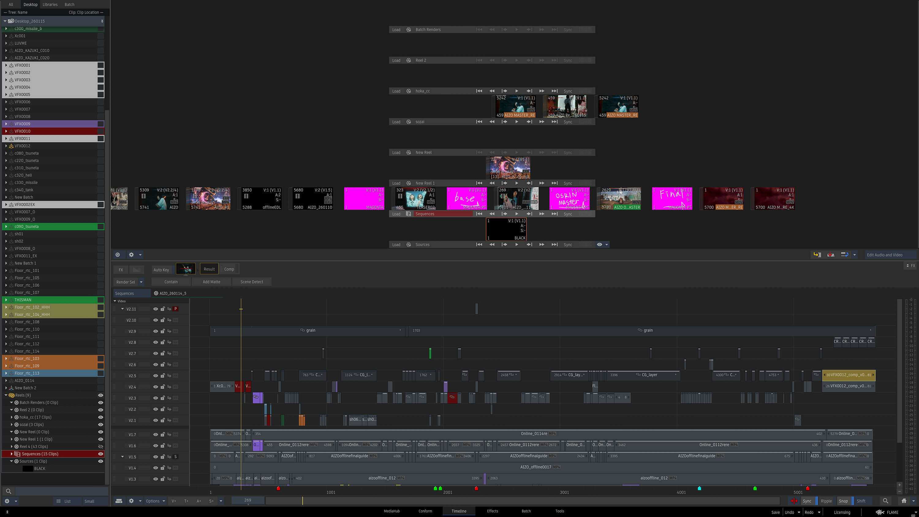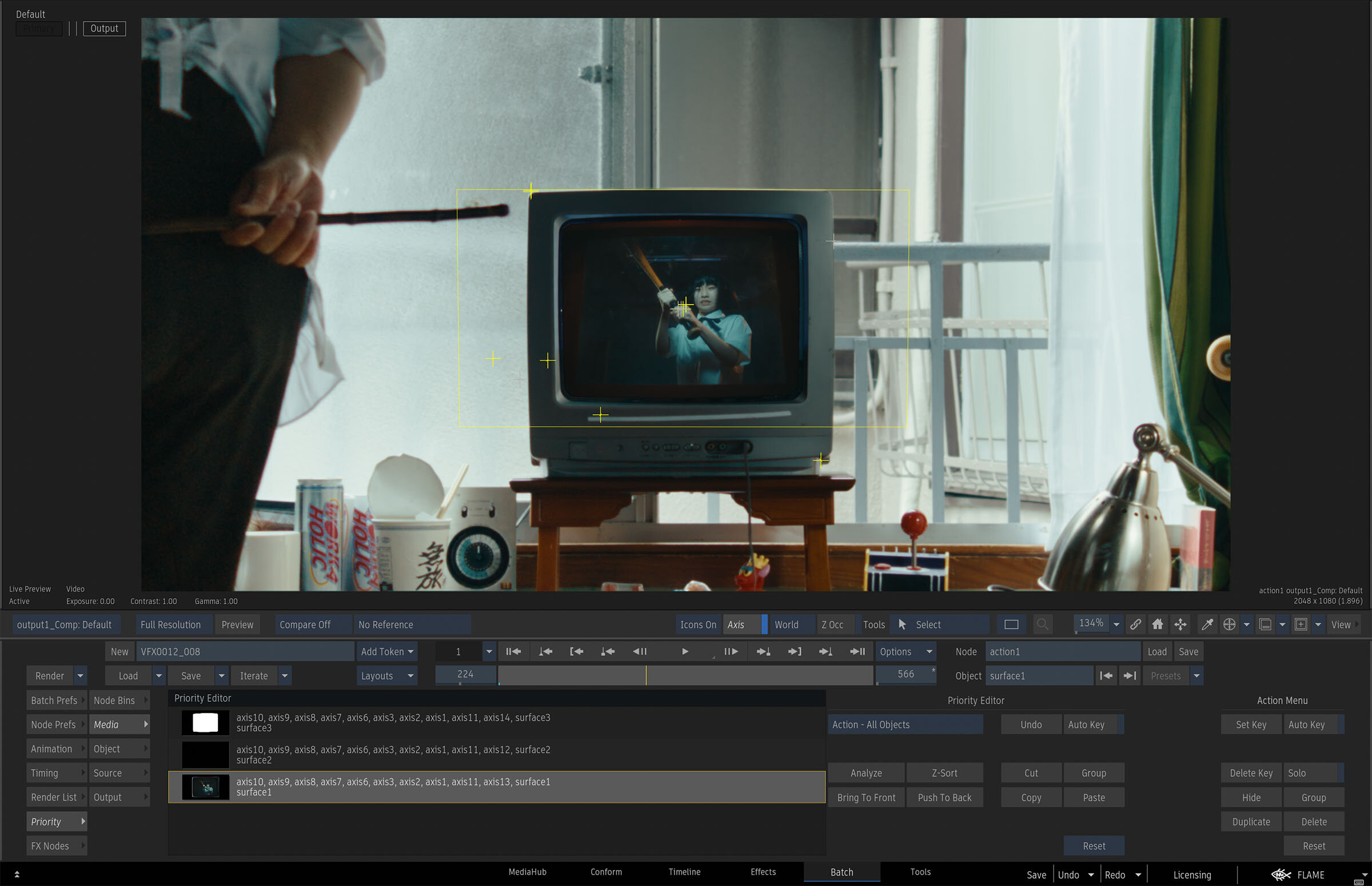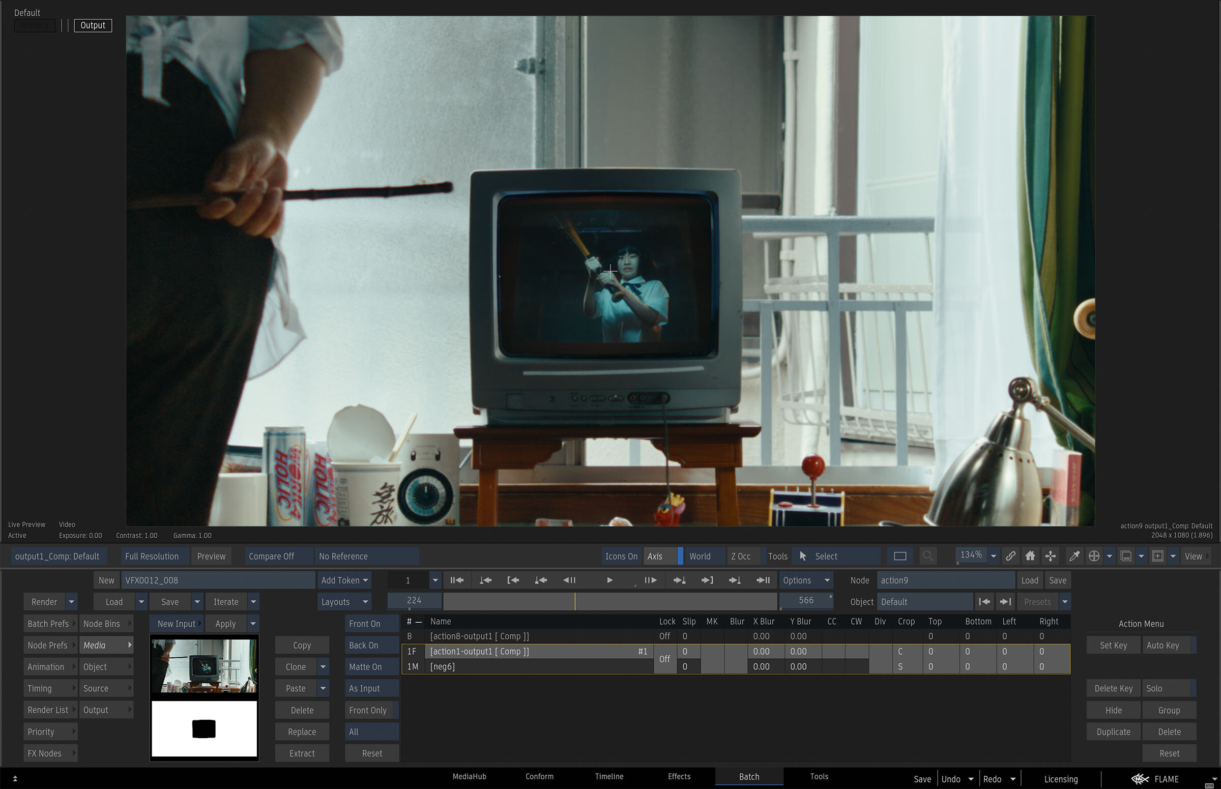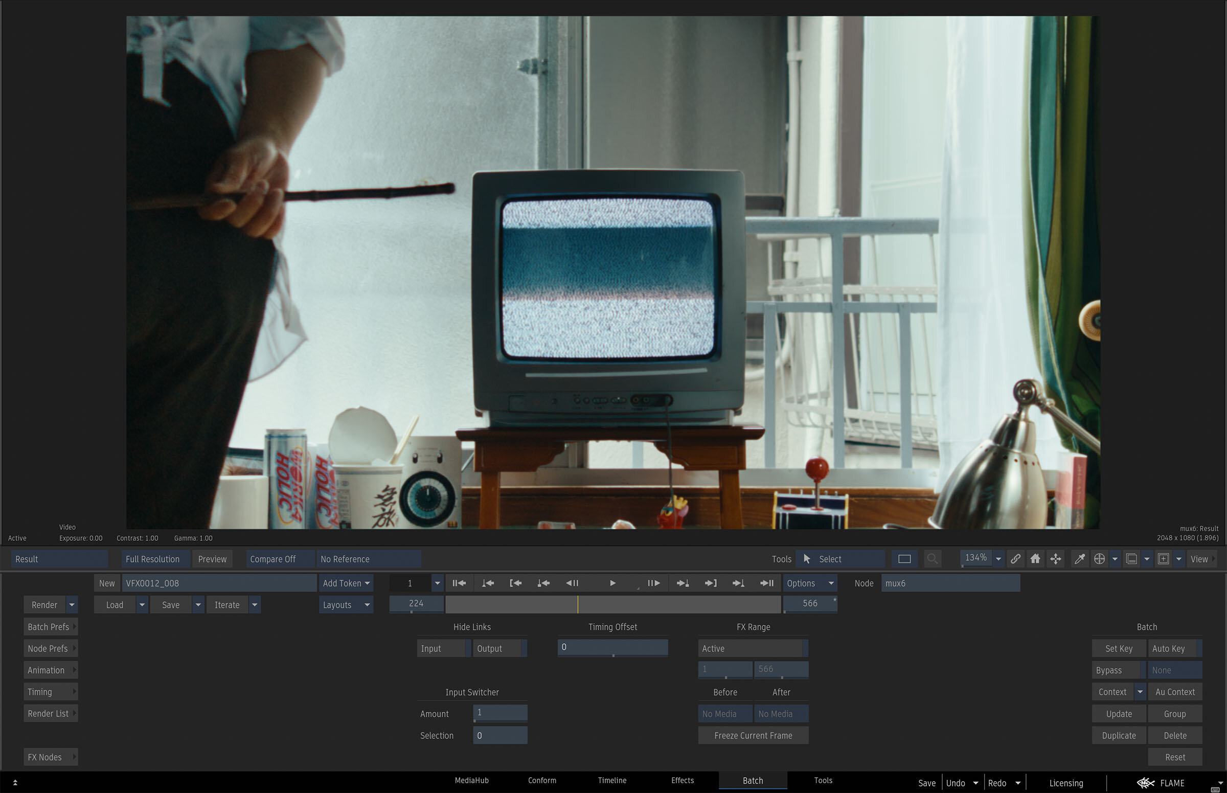 堀江氏は、PERIMETRONの案件が本件以外も多く稼働している状態にあるため、それらの作業の最中に本件の内容も自然と聞いていたそうだ。「CGチームがショット単位で9割方の責任をもって完結させるスタイルだったので、EXRの連番データ以外はリクエストしませんでした。私がCGパートで行なったのは、映像データのエラー修正とルックの調整になりました。またOSRIN監督は最後の最後までご自身でもPremiereでエディットを試行錯誤されるので、FlameとPremiereを何往復もすることになります。だから編集内容が先祖返りしないよう、細心の注意を払いました」(堀江氏)。