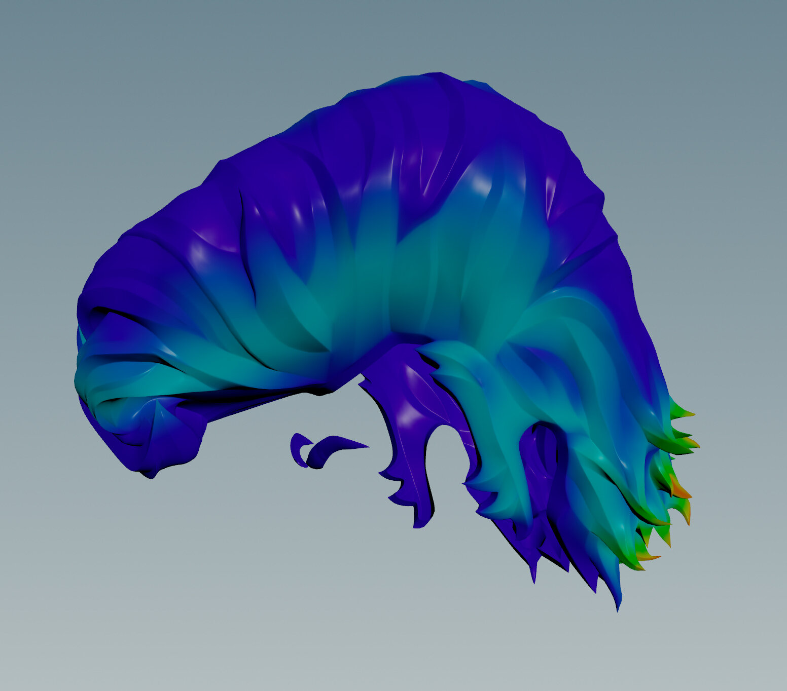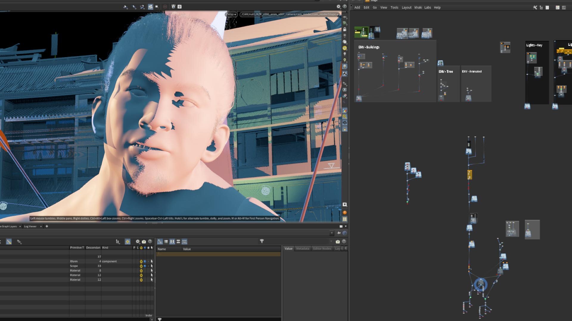 ▲ 風を受けて、愛羅武遊の髪や頬が激しく揺れる横顔のカット。Houdiniの「Attribute Noise SOP」で乱れを加えて表現された
