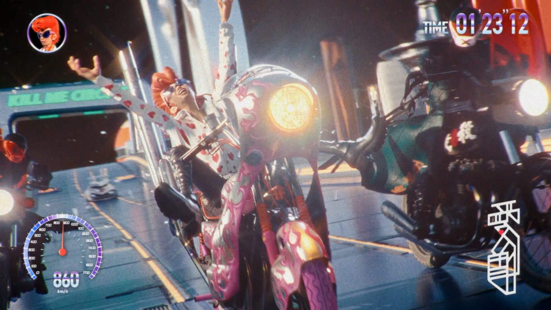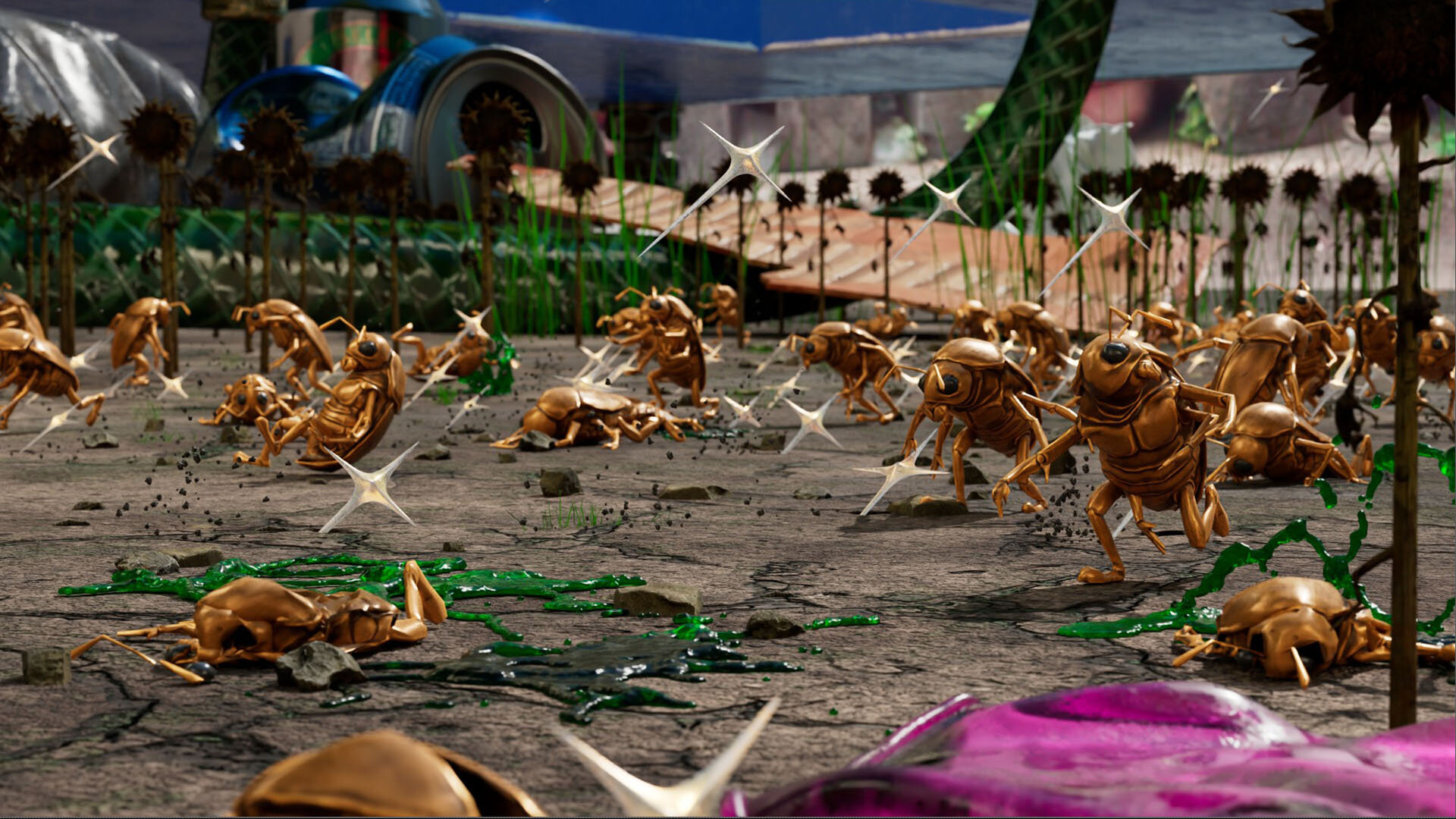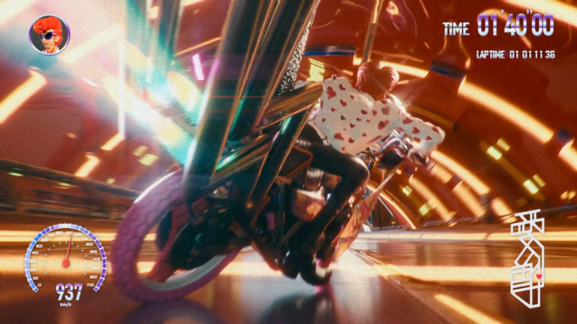 「社内コアメンバー5名を2班に分けて制作を進めました。外部パートナーさんにはアニメーション作業を中心に手伝っていただきました。アセット制作はMaya、Cinema 4D、Blenderなど担当者が使い慣れたツールで対応し、ショットワークはHoudiniに統一。レンダラはRedshiftとKarmaを使い分けました。物量が多かったため、USDの有用性や不具合発生時のリカバリーを考慮してあえて2種類を採用しました。またゲームのリファレンスとして『F-ZERO』などが挙がる一方、OSRIN監督からは『イナタさ』も求められました。そこでSF的な景観に1980〜1990年代の家電やビデオゲームがもつレトロなデザインを組み合わせながらエンバイロンメントを制作しました」(古澤氏)。