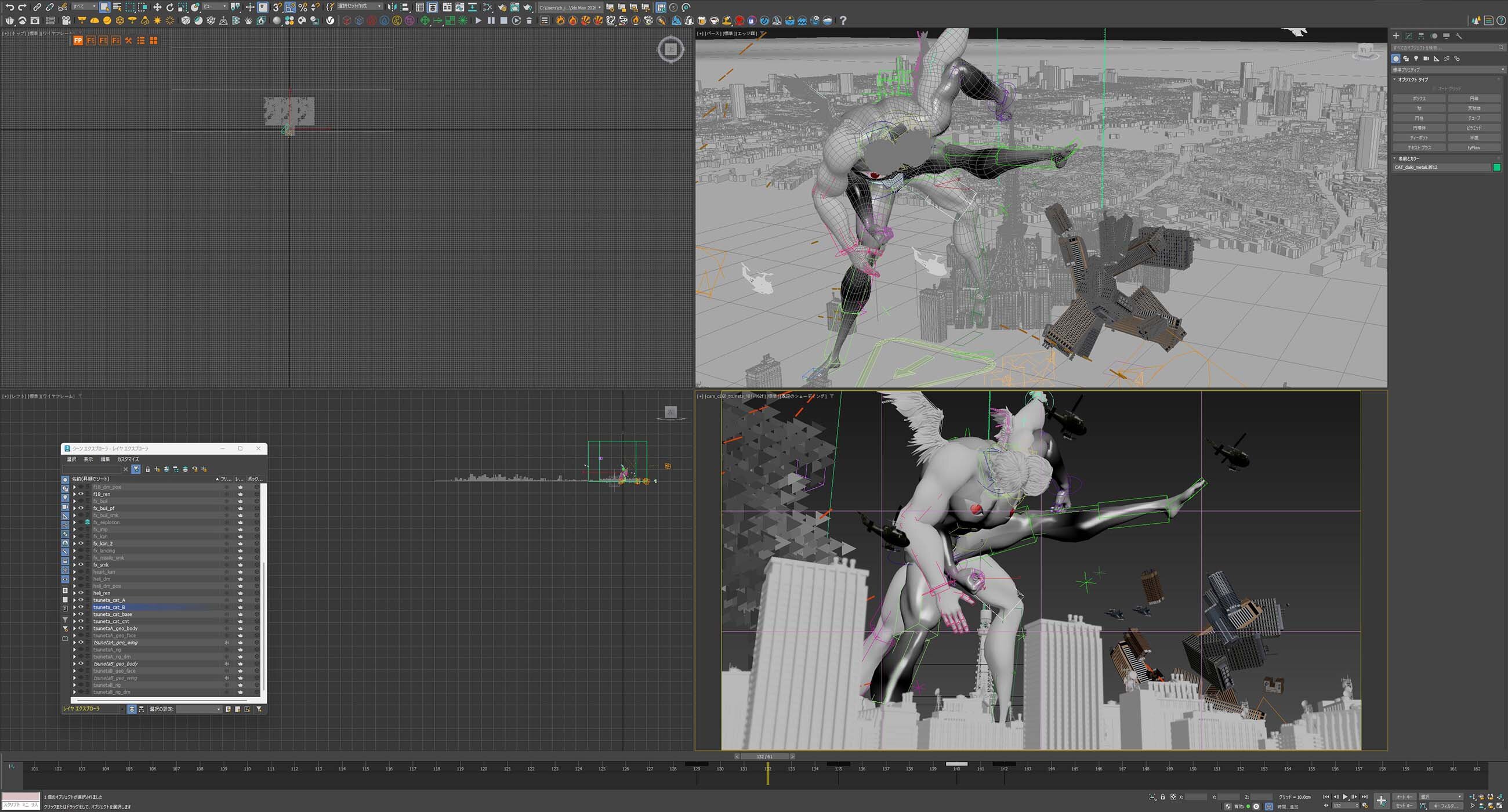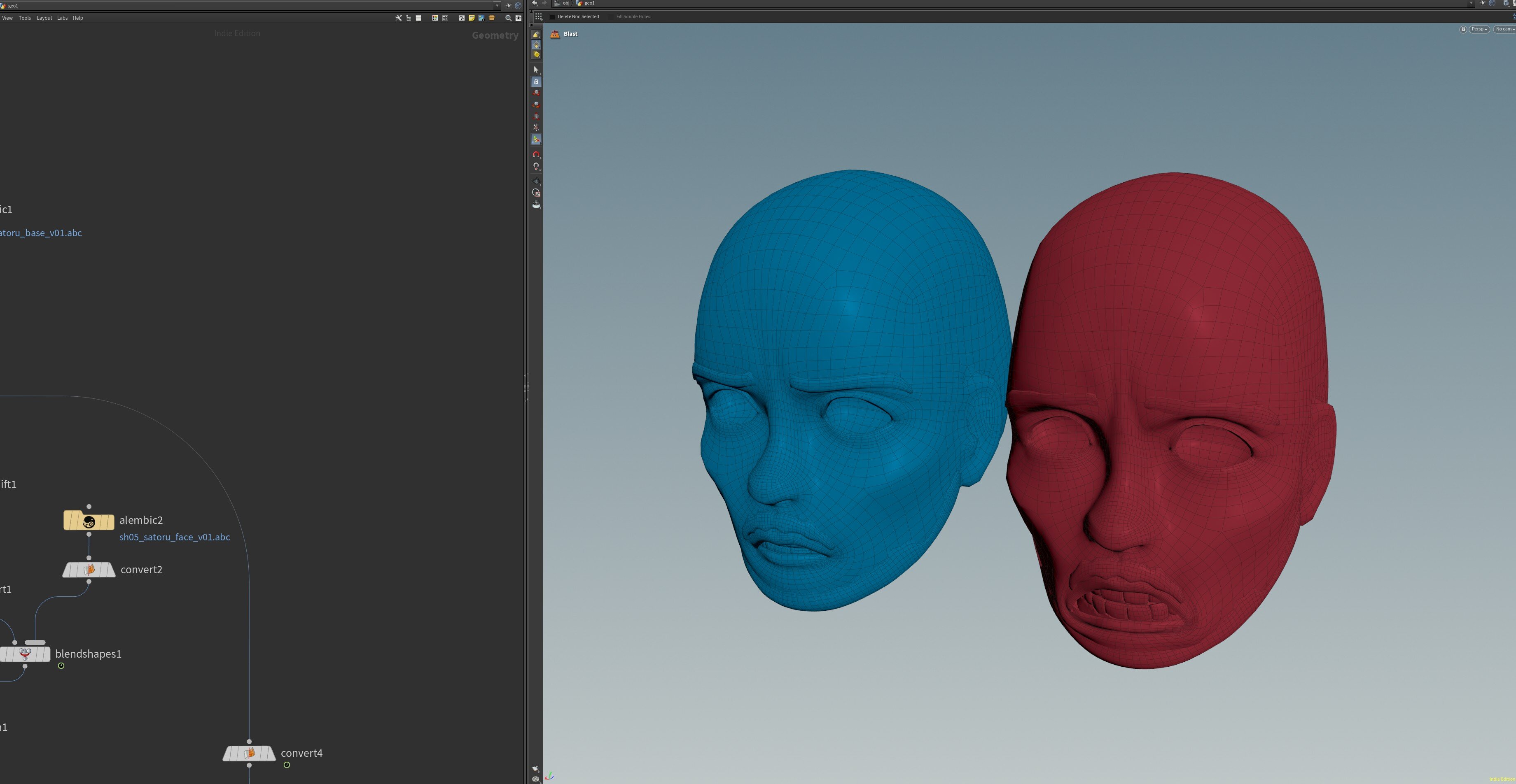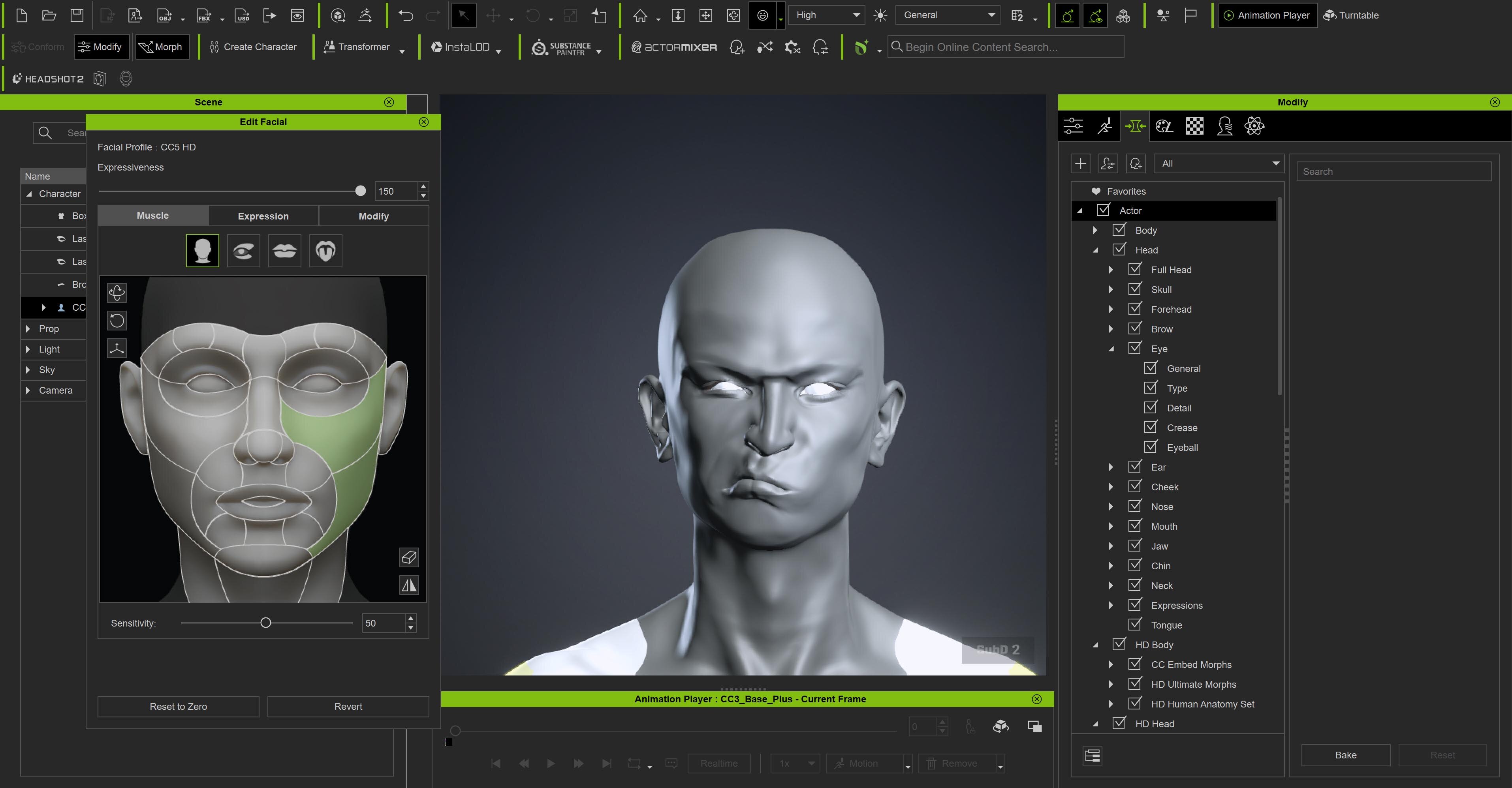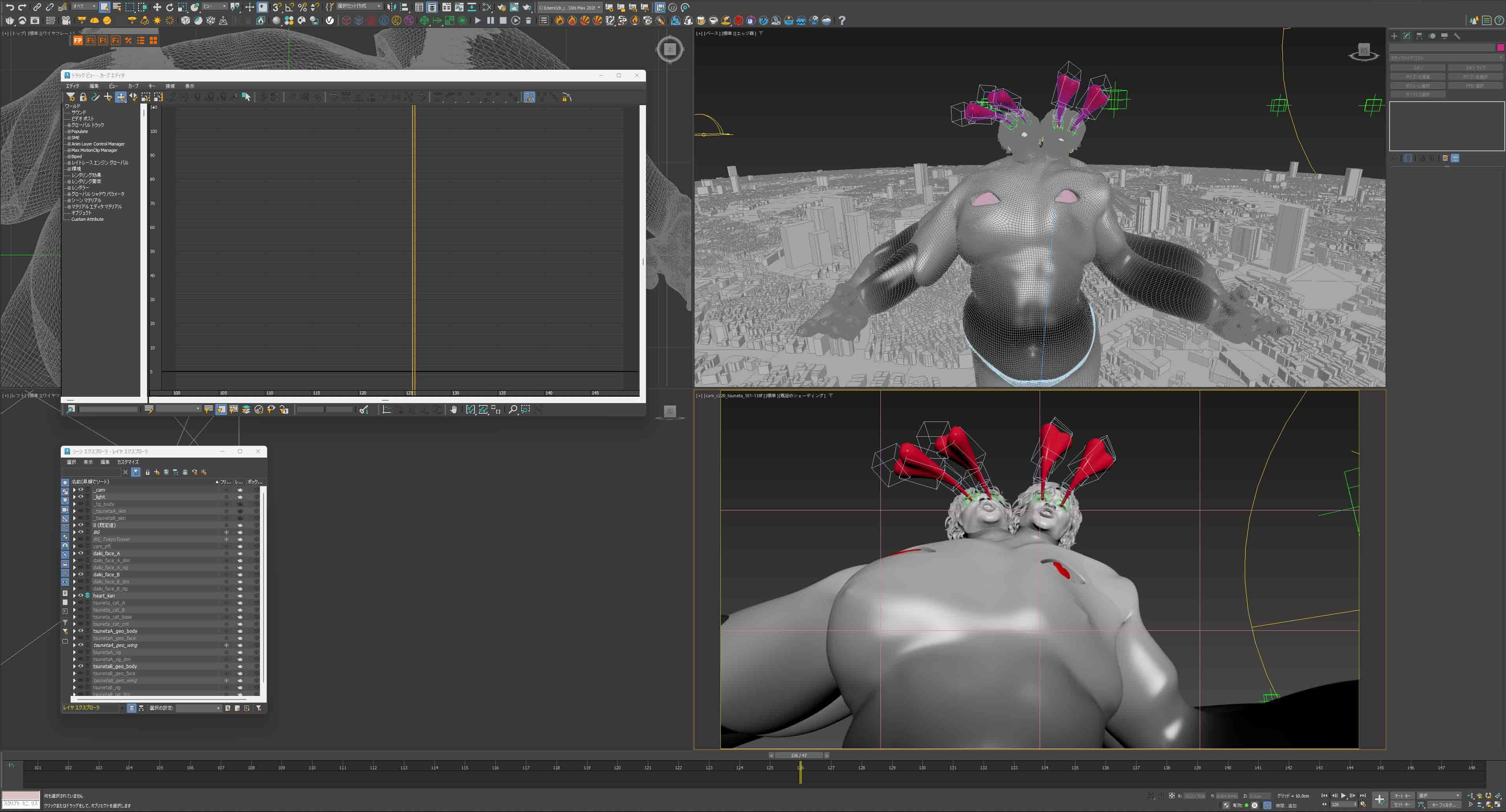 「ショットワークの物量が膨大だったため、モデル制作と並行してアニメーションやエフェクト作業を進めるべく、頭部のモデリングにCharacter Creatorを利用しました。モデルが出来上がった時点でポーズ付けに十分なセットアップがひと通り揃っており、表情ターゲットもパラメータ調整で対応できるのが利点です。本来はモーフターゲットを整理した方が効率的ですが、そこは割り切りました。ショットワークも並行して進める必要があったので、頭部ナシのモデルを石野に渡してレイアウトを先行させました」(齊藤氏)。