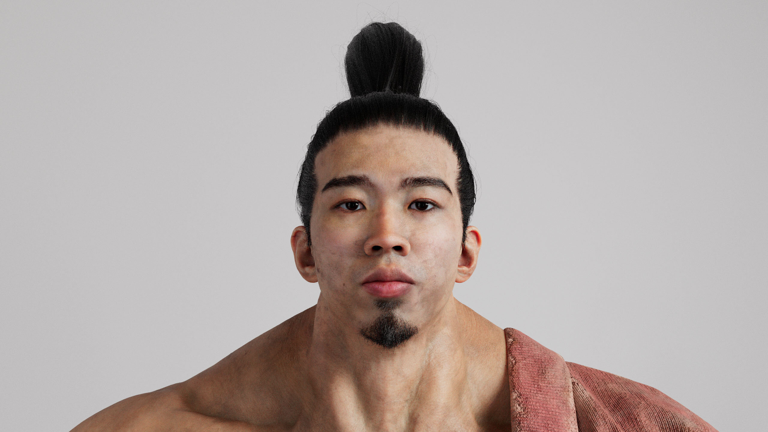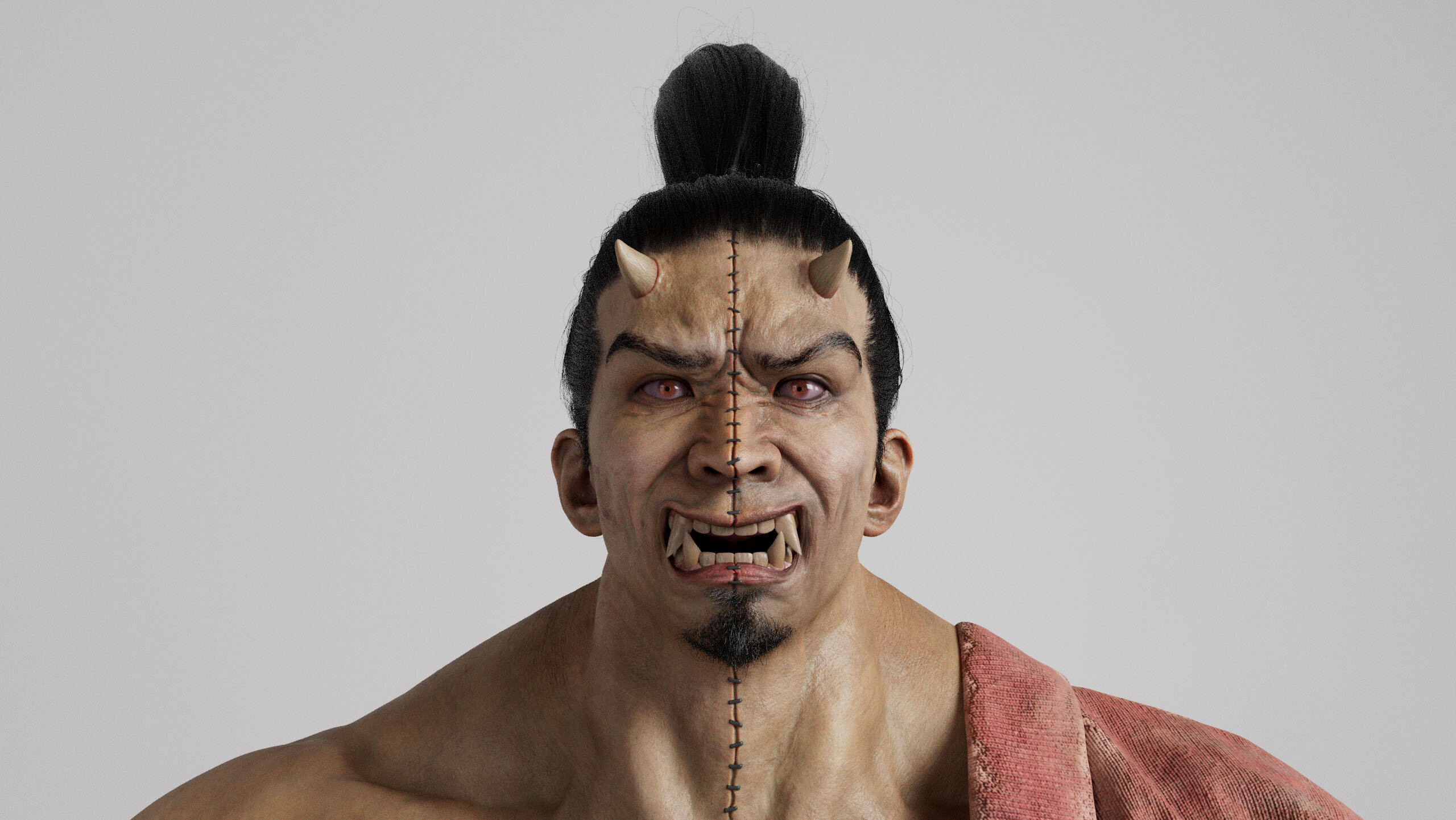 SAMURAI ARAIでは新井和輝本人に近づけたフォトリアルな造形が採用された。後半の鬼化シーンでは専用モデルをゼロからつくるかわりに、既存のフェイシャルリグを変形して流用しつつ、画像生成AIで作成した鬼の表情から必要な形状だけをキャラクターモデルに加えることで効率化を図ったそうだ。