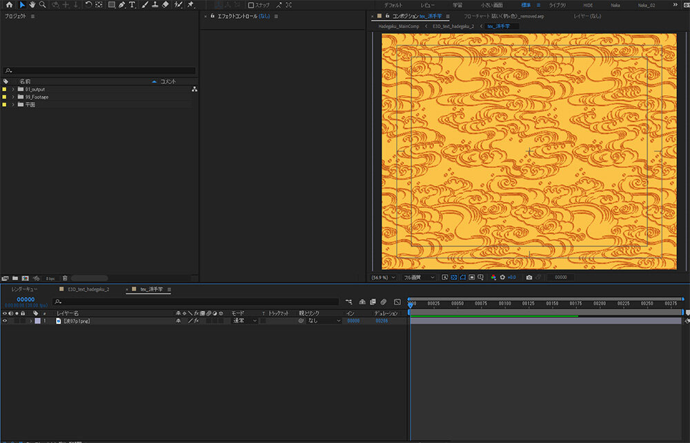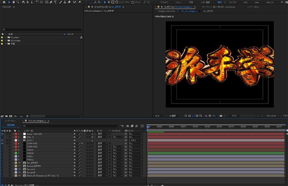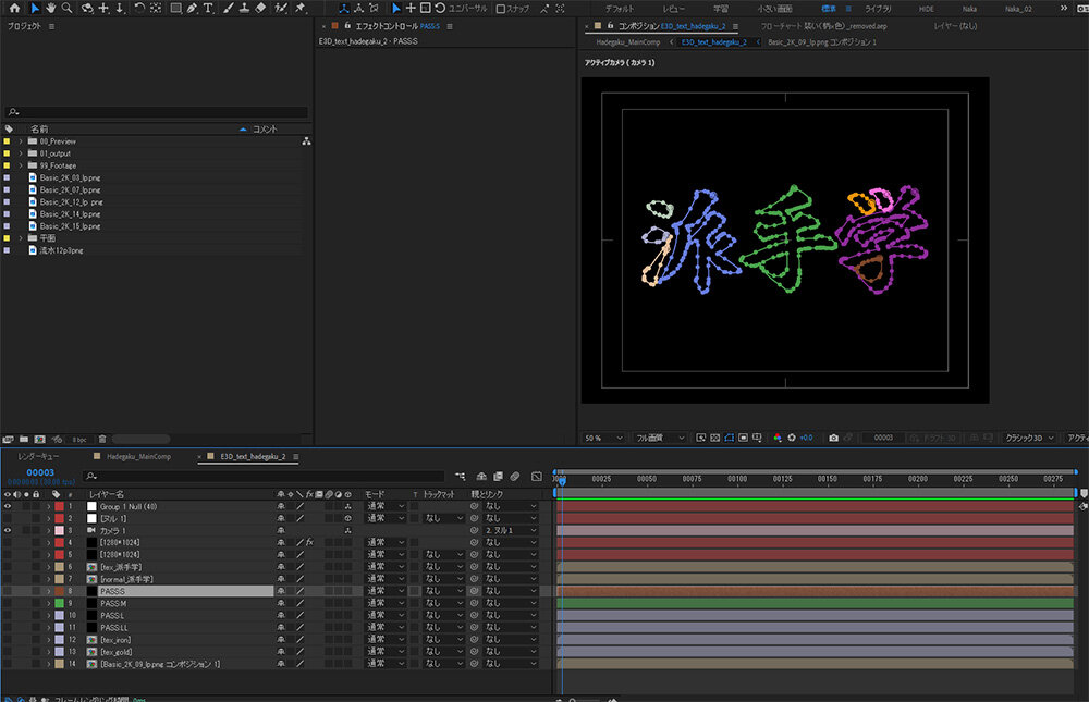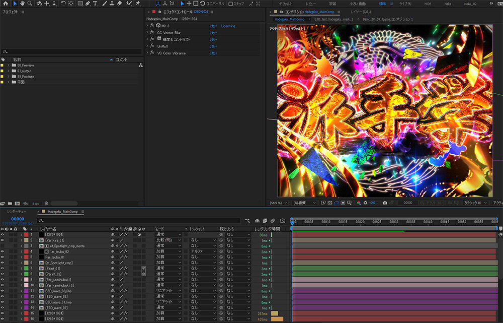 こちらが今回の「派手学」の完成ビジュアルで使用しているElementのコンポジションです。4番目のレイヤーがElementを使用している黒平面のレイヤーになります。