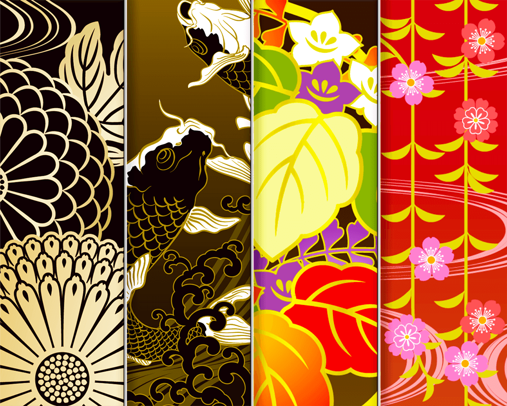 派手の表現をデジタルが生まれる以前まで歴史を遡ると、ひとつの答えが見えてきます。古来、日本で表現された派手とは、和柄と色の組み合わせによるものでした。以下の画像を比較してみると、組み合わせから生まれるデザイン性が派手さを表していることがわかると思います。
