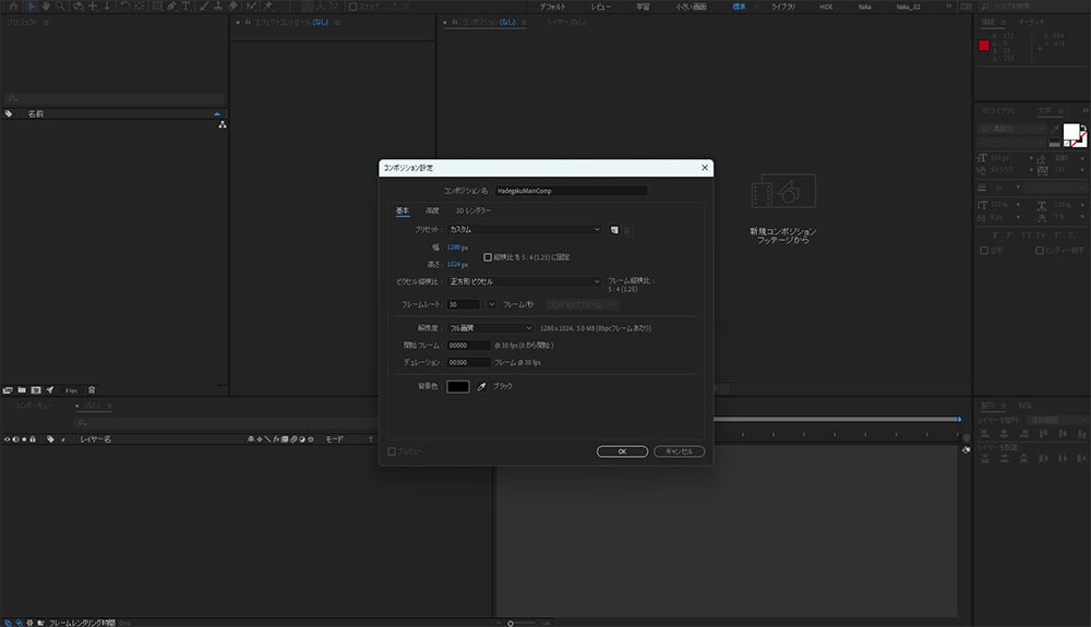 まずはElement 3D用のコンポジションを作成します。今回はオーソドックスな遊技機の液晶サイズ1,280×1,024のサイズで作成します。なお、画面のシェイクなどの+αの要素を考慮しておくと、ビタビタのサイズではなく100ピクセルほど余裕をもたせたコンポジションサイズで作成することをオススメします。