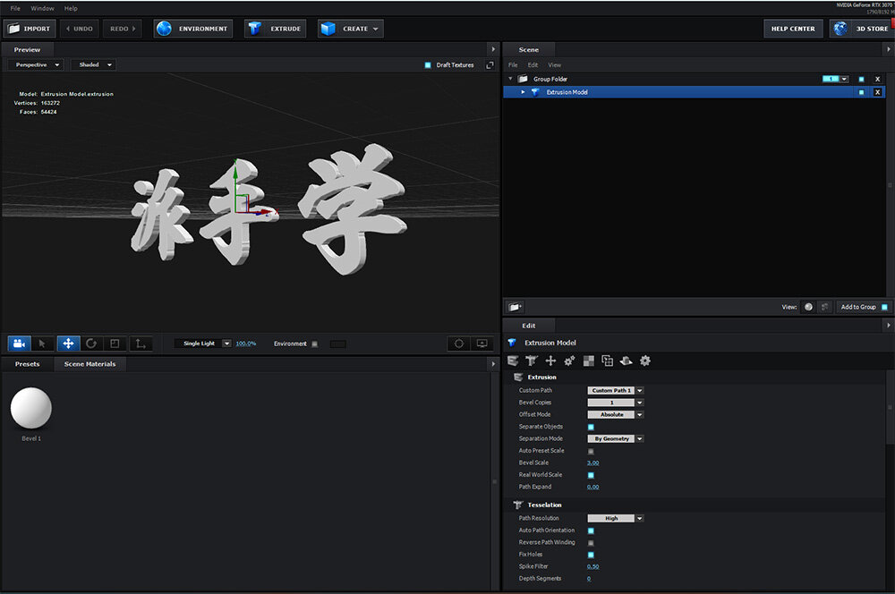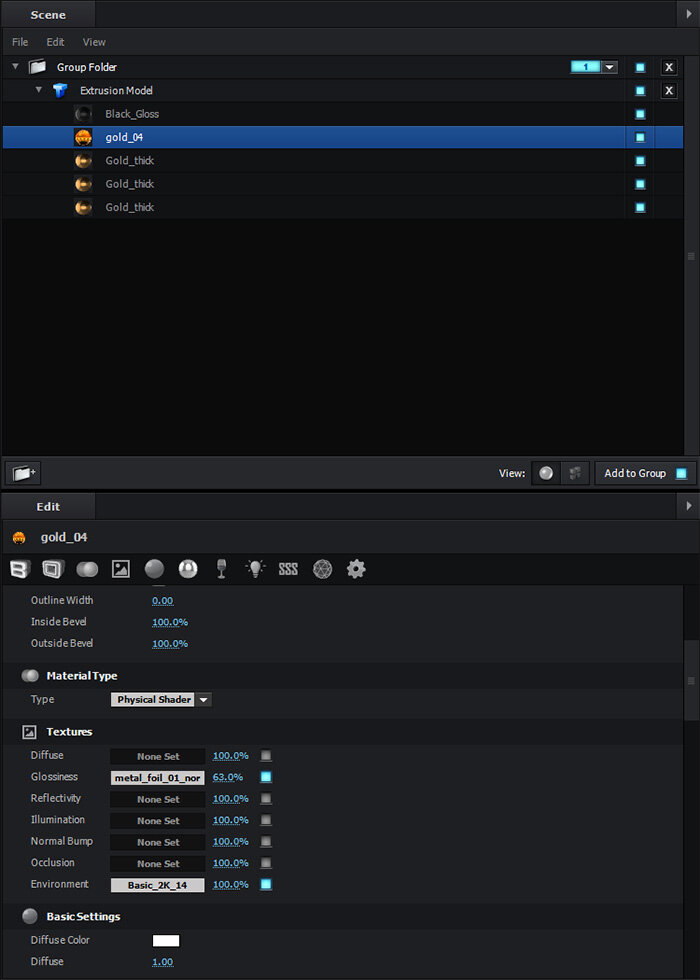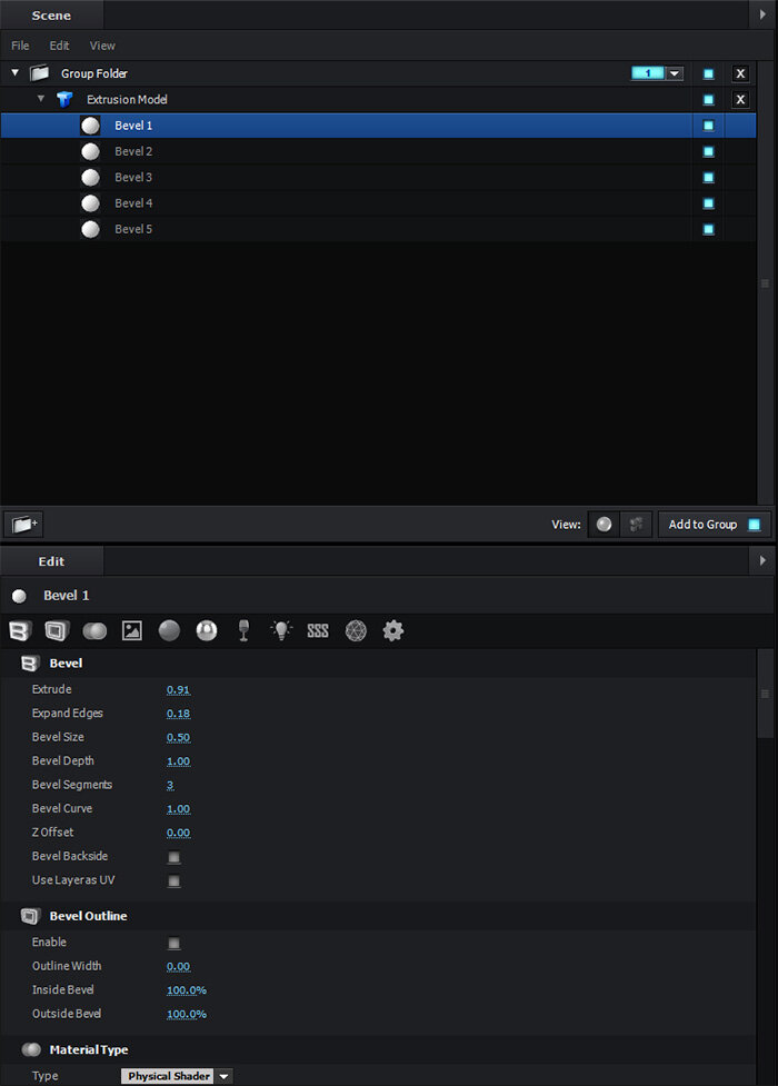 今回押し出したExtrusion Modelが右のSchene内に確認できると思います。矢印をクリックするとBevel1というマテリアルがぴょこっと現れます。