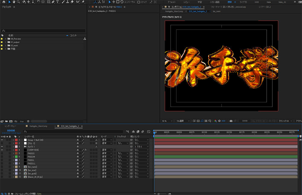 さて、今回はNormal Bumpを使って模様を疑似的に表現しました。この手法の別の方法としては、波のパスを文字に押し出して適用し、その模様を別レイヤーに複製、「派手学」という同じ文字でトラックマットをつくり、文字からはみ出した部分をマスクで隠す、という手順でも実現可能です。こちらの方法を採れば、模様部分に立体的な膨らみをもたせられるので、よりリアルな質感を出せるでしょう!