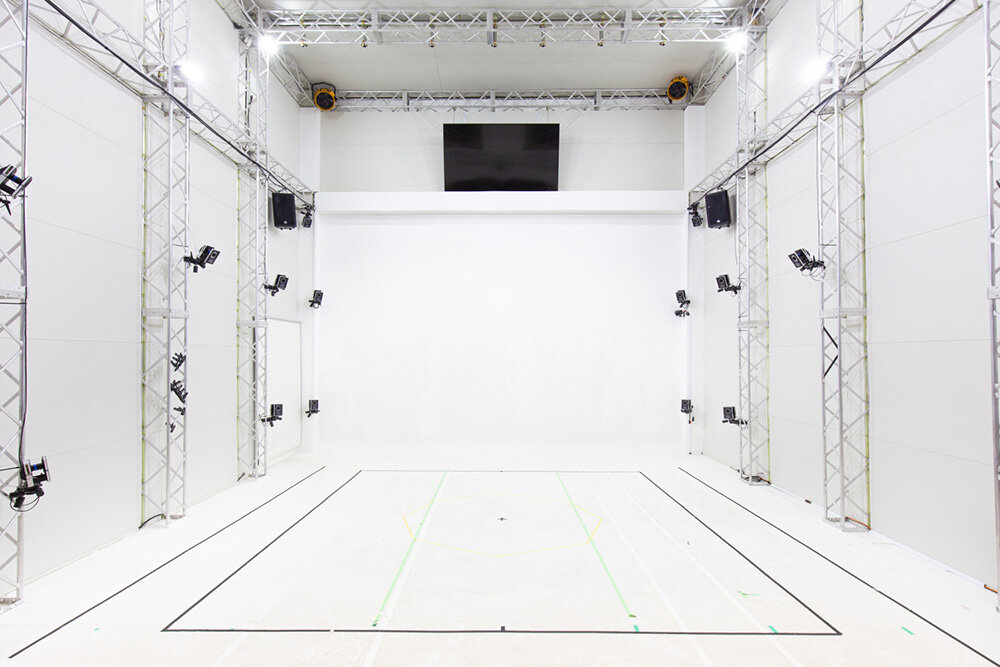 6m×9m、高さ4mのアクターエリアに48基のVICON。通常のアクターエリアと比べ2倍のカメラを完備することで高密度の撮影が可能。モーションノイズが少ないため、納品が早く生放送にも有利なスタジオです。繊細な指の動きや、ブレイクダンス、背の高い小道具を使用した撮影が得意です。防音スタジオにより音声収録も可能。撮影・照明機材も豊富でバーチャルセット撮影もリアルタイムで可能。プレビュー環境にも力を入れており、クライアントチェックもしっかり行えます。