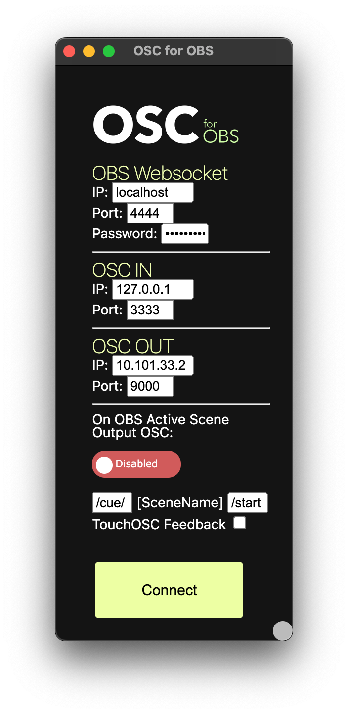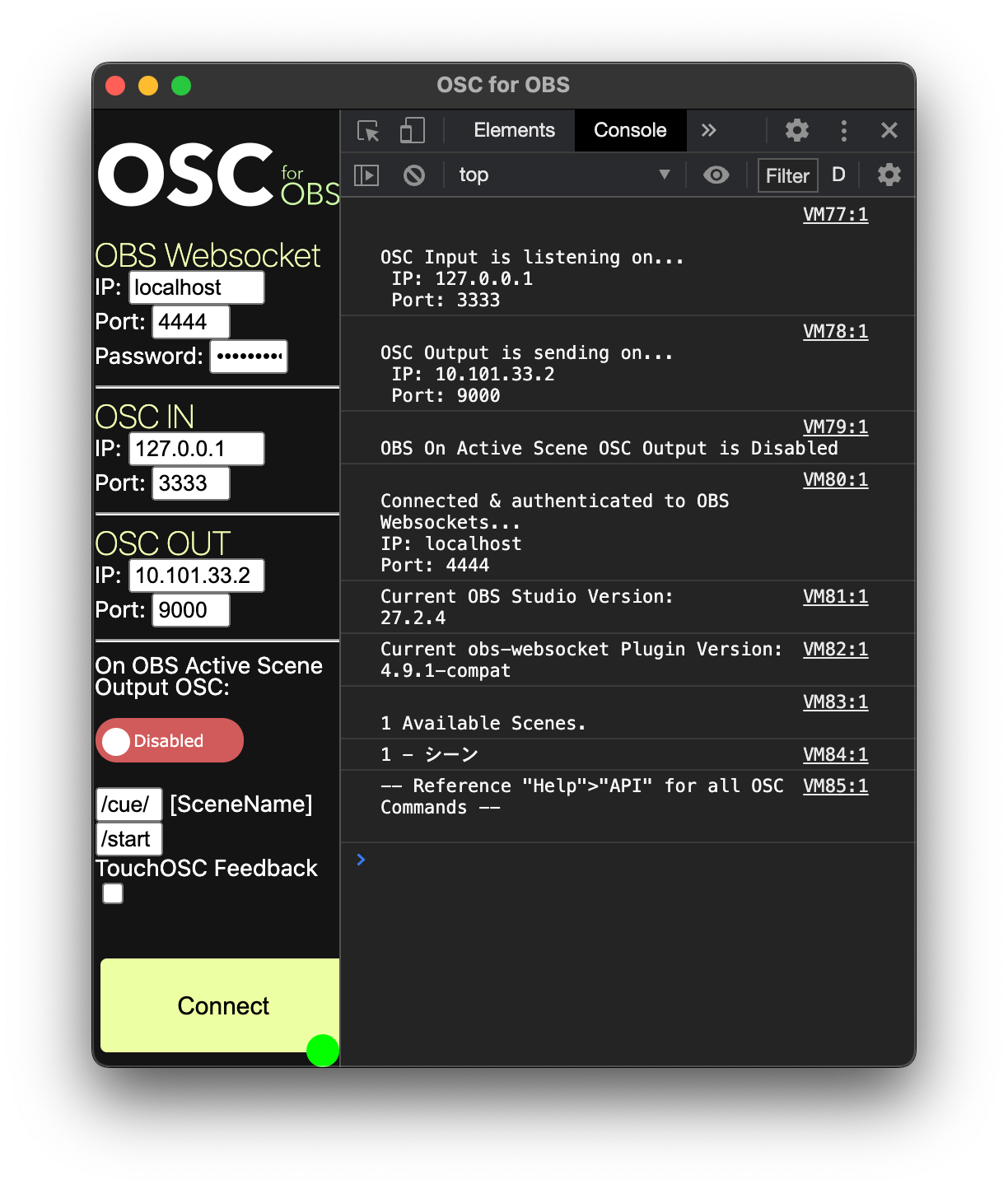 アプリを起動し、「Connect」ボタンをクリック。緑色の丸(●)が表示されたら、OBSとの接続成功です。