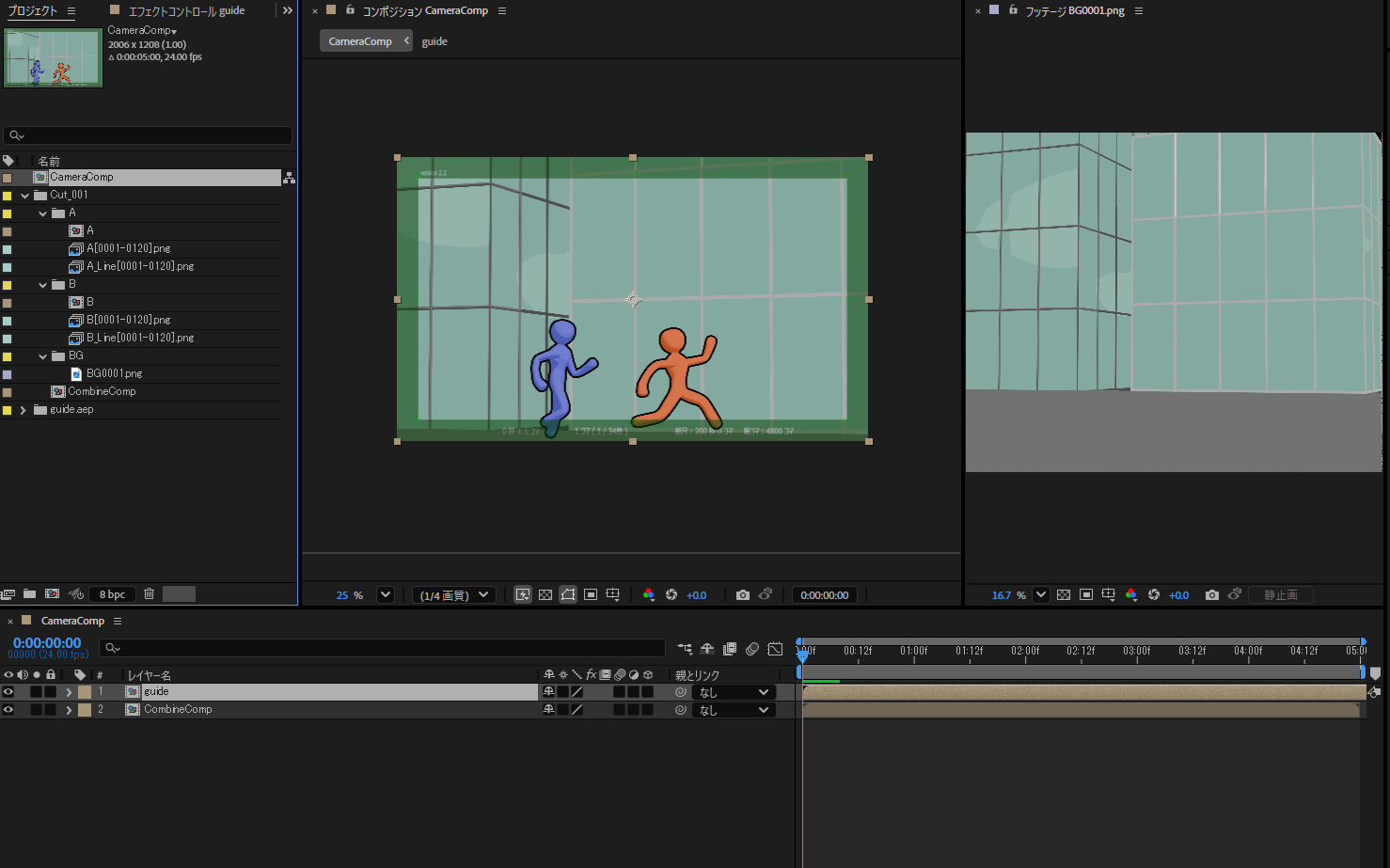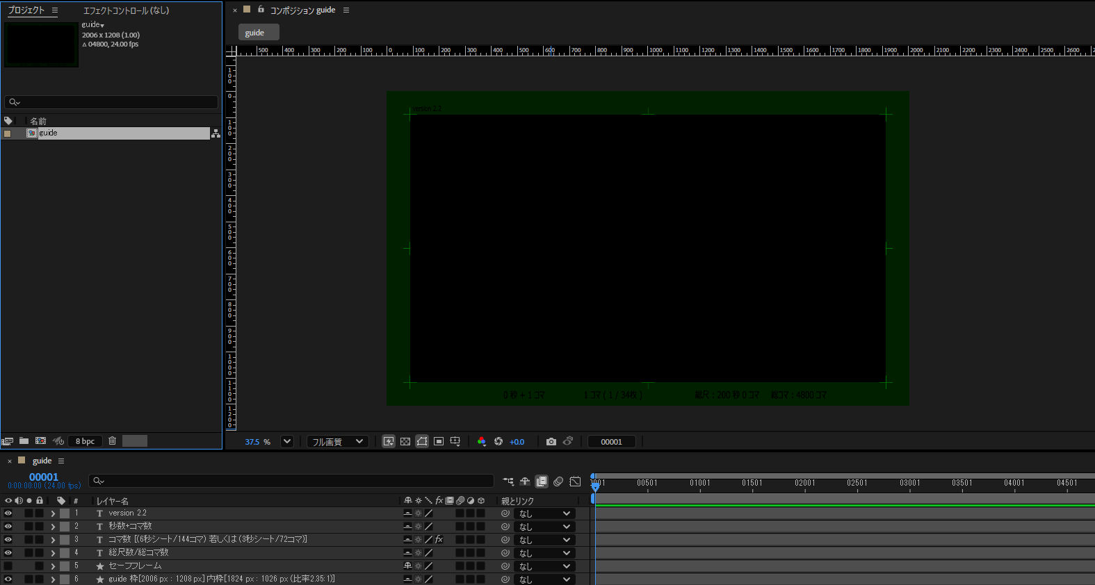 スクリプト実行時に使うガイド用のAEプロジェクトファイル(guide.aep)を用意します。このファイルには、カメラガイド用のフレームや目安となるライン(コマ数、秒数、枠線)が含まれています。カットに合わせてコンポジションのサイズやフレーム数を調整してください。一度設定しておけば、同じサイズのカットに使い回すこともできます。