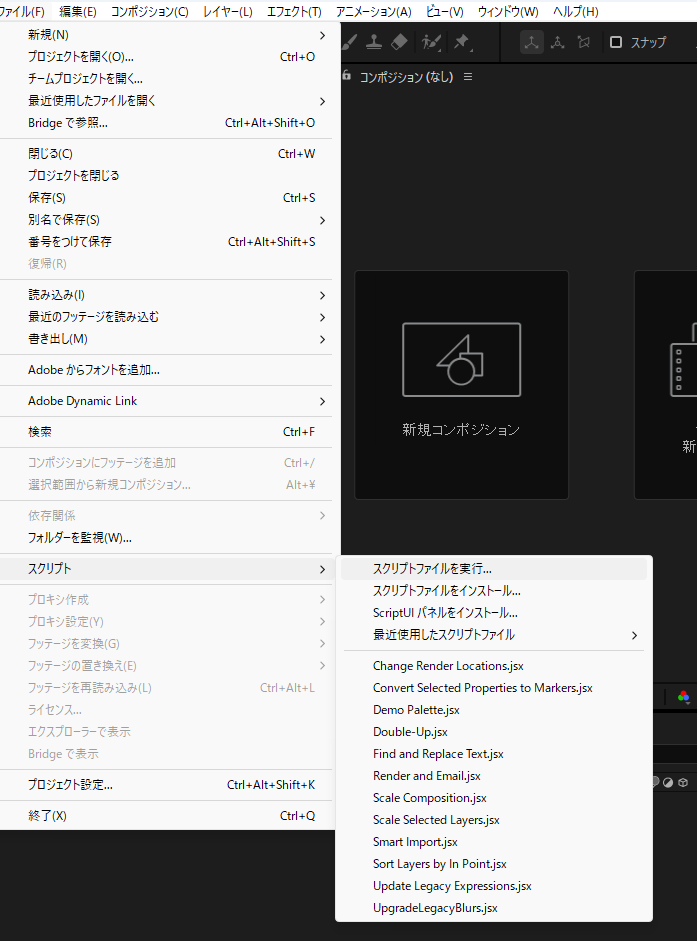 AEを起動し、新規プロジェクトを作成します。その上で、以下の手順でスクリプトを実行します。