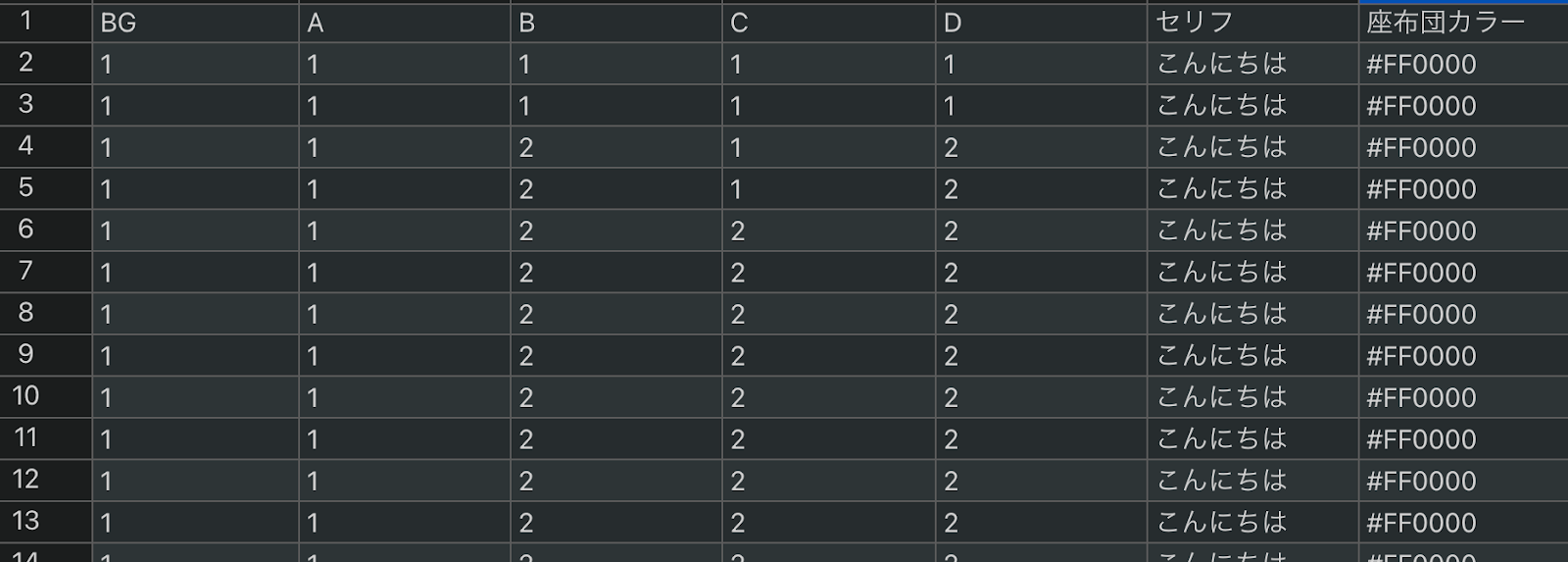 各素材をどのタイミングで表示するかを指定するタイムシート(CSV形式)を用意します。リポジトリ内の examples/ フォルダにサンプルファイルがあるので、まずはそれをコピーして編集してみてください。用意した素材に合わせてフレーム番号やセリフを変更しましょう。