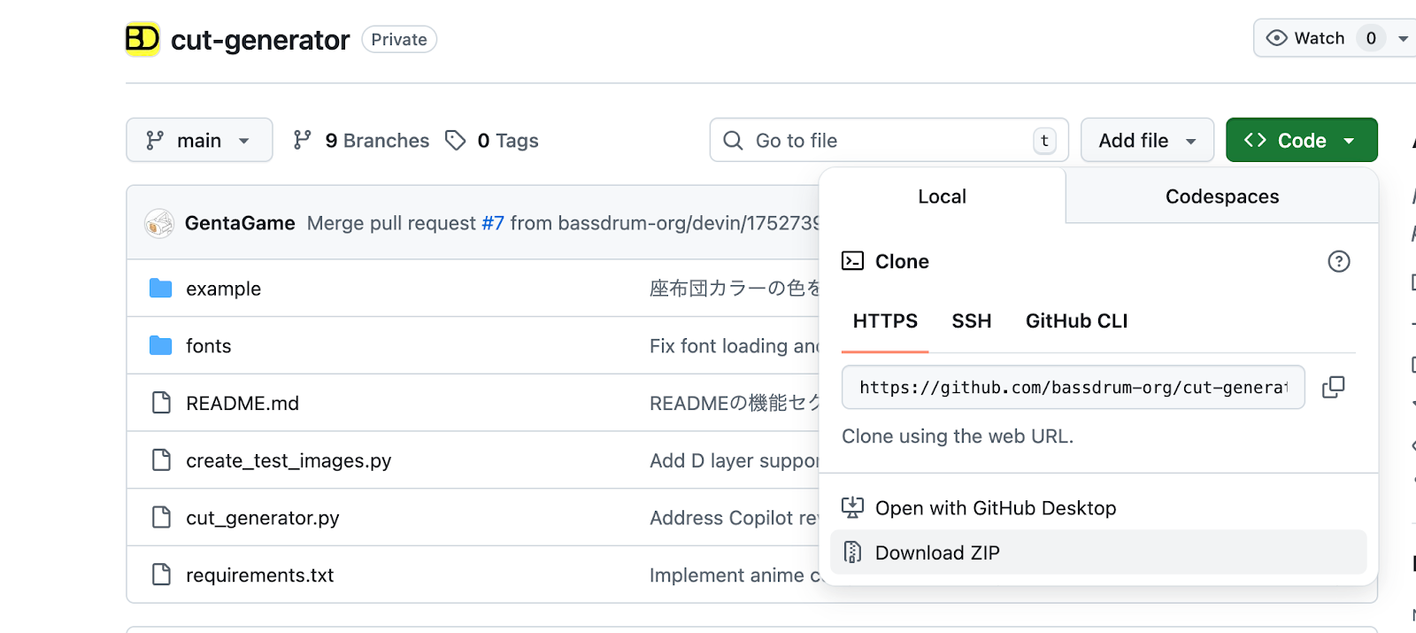 GitHubのリポジトリ(このプログラムを公開している場所)に移動し、「<> Code」という緑のボタンを押します。次に、「Download Zip」を選択し、プログラムファイルをダウンロードした後、解凍します。