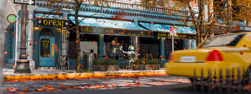 前景のタクシーとお店のブルー、そして枯れ葉の色合いが美しく調和しており、全体として質感が印象的な作品です。椅子に座ったロボットが店員からコーヒーを受け取るシーンは、楽しい想像を掻き立てます。ボケやブラーの効果も巧みに使われており、良い雰囲気です。さらに完成度を高めるためには、木の葉の部分にもう少しSSS(サブサーフェス・スキャッタリング)を効かせて、より生き生きとした質感を出すといいのではないでしょうか、また光に照らされた道路などの色味を調整し、照明と空の雰囲気がより自然に調和するように仕上げることで、作品全体がさらに豊かになるように思います。