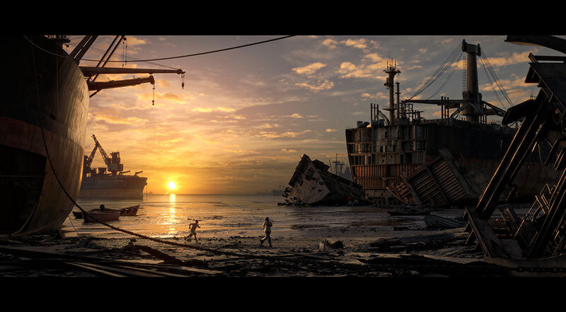 (CG Supervisor 鎌田 友樹)解体された船と美しい夕日が対比しており、その中で遊ぶ人が絵の雰囲気を構築していると感じました。