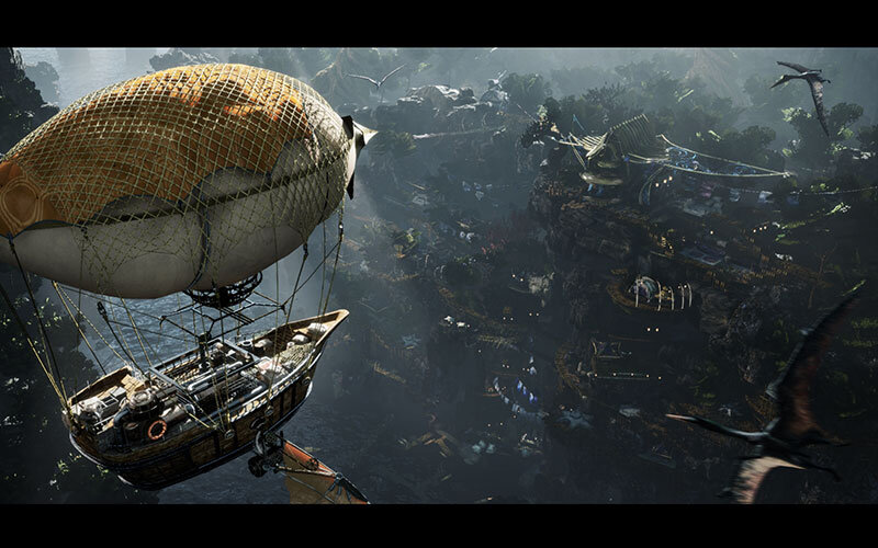 崖にある集落へ飛行船で交易をしに来たシーンを作りました。ぱっと見の広い空間や、村と飛行船の文化や技術レベルの差を楽しんでもらいたいです