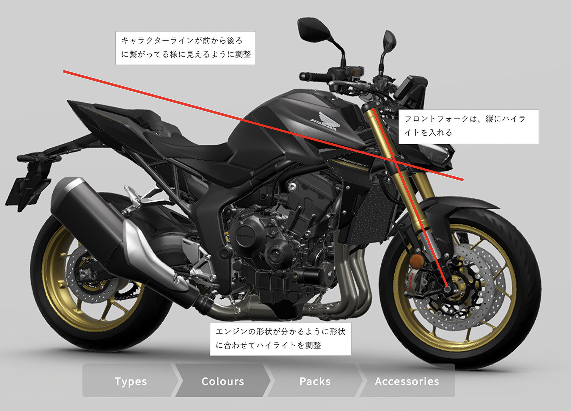 そのほか、キャラクターラインが前から後ろへとつながって見せるようにレイアウトを調整する、フロントフォークにはハイライトを縦に入れる、エンジンなどメカニカルなパーツは形状がわかるようにライティングを調整するといった部分は画づくりの際に意識しています。