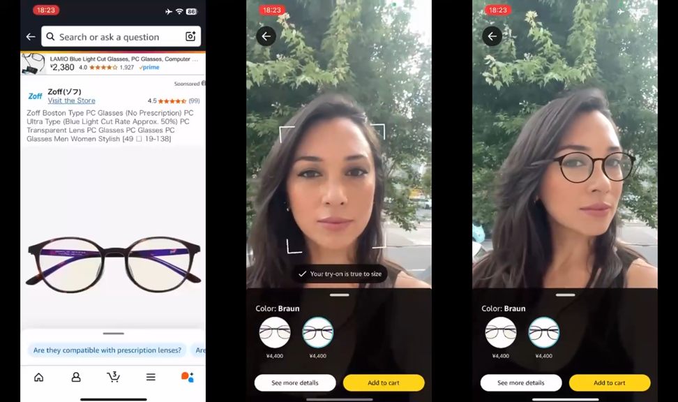 次に紹介するのは、メガネプランド「Zoff」のAmazon公式ストア向けバーチャル試着ソリューション。これは、Zoff Amazon公式ストアで販売する一部の商品に導入されたものでスマホやタブレットを使ってAmazon公式アプリから該当する商品ページにアクセスすると体験できるものだ。