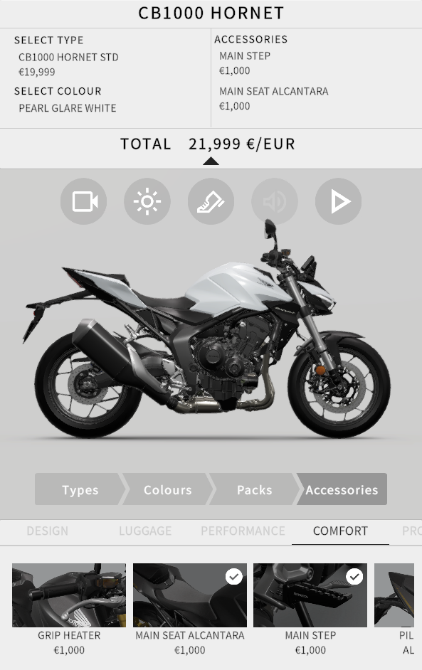 2番目に紹介する事例は、Honda(本田技研工業)バイクのWebGLコンフィギュレータだ。スマートエンジニアは昨年、店頭の大型ディスプレイで体験できるアドベンチャーバイクのフラッグシップモデル「Africa Twin」のコンフィギュレータを手がけているが(※詳しくは、こちら)、その知見を活かして新たにWebブラウザで動作するグローバル展開を視野に入れたコンフィギュレータの開発にチャレンジした。