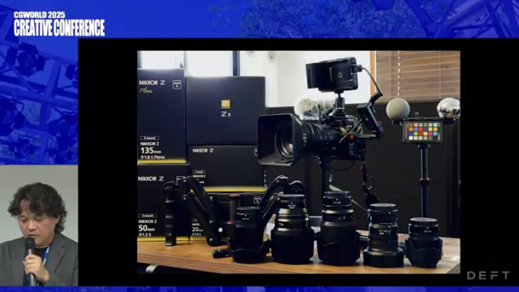 絵コンテの次に紹介されたのは、3ds Maxで制作されたプリビズだ。DEFTでは実写の撮影機材としてNikon Z8を使っており、20mm、35mm、50mm、135mmのレンズで撮影することが多く、一部Nikonから借りたというフィッシュアイ(魚眼)や大きなズームレンズなども取り揃えている。ショットやコンポジットが複雑になってくると、カラーチャートや銀玉(グレーボール)を置くそうだが、今回は2時間程度とタイトなスケジュールの撮影だったために実施しなかったそうだ。