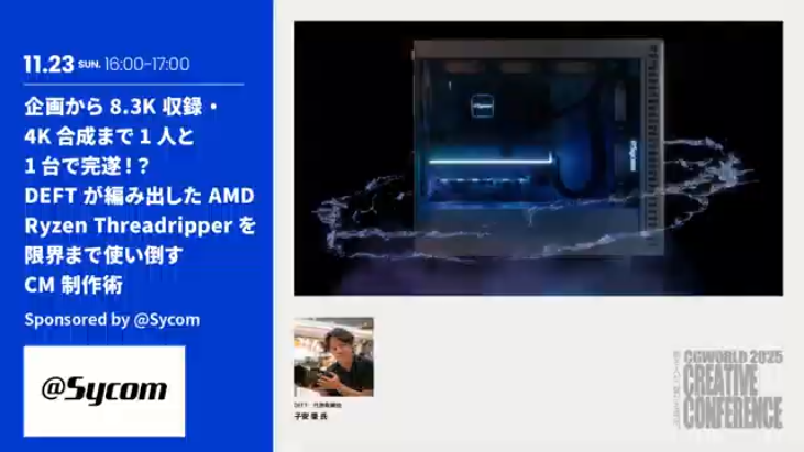 2025年11月23日に開催されたCGWORLD 2025 CREATIVE CONFERENCE。同イベントのセッションのひとつであったDEFTの子安 肇氏によるセッション「企画から8.3K収録・4K合成まで1人と1台で完遂!? DEFTが編み出したAMD Ryzen Threadripperを限界まで使い倒すCM制作術」の模様をお送りする。