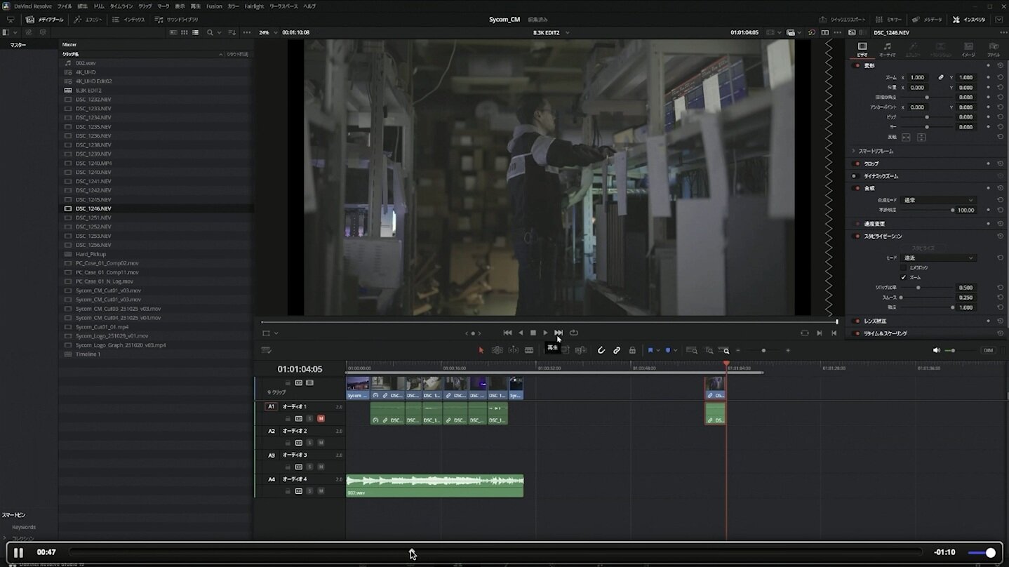 今回のプロジェクトは検証機のマシンスペックの検証を兼ねていたこともあり、本制作の撮影作業では解像度・FPSはN-Raw 12bitの8.3K・60fpsという形式で収録することを選択。子安氏は「撮影素材を検証用PCに読み込んで編集作業をするわけですが、DaVinci Resolveで8.3KネイティブのN-Rawムービーがサクサク動いたのには驚きました。メディア解像度は8,192pixelとなっていて、そのまま8.