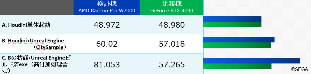 阿部:時間だけを見ると、興味深いことにRTX 4090の方が速いんです。特に高負荷な「C」のパターンでも、RTX 4090は57.265秒、W7900は81.053秒でした。しかし、RTX 4090は最も負荷が高い状況で、実機のEXE側を操作すると描画遅延が発生したり、不安定になったりする挙動が見られました。おそらくHoudiniとのメモリの食い合いが起きたのだと思いますが、タイミングによってはクラッシュしてしまうこともありました。