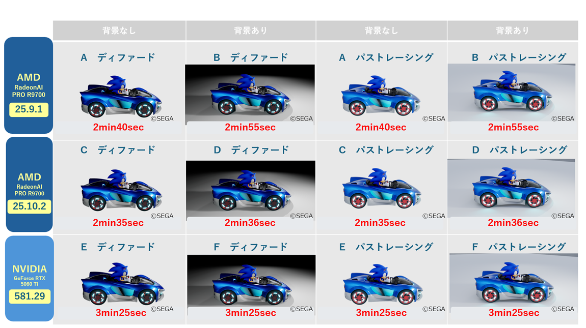 AMD Radeon™ AI PRO R9700(左)とRTX 5060 Ti(右)での撮影結果の比較。デノイズ機能をオンにした状態での再検証を行なったところ、車体側面のグラデーション処理や溝部分などのパーツに差異が見られた。