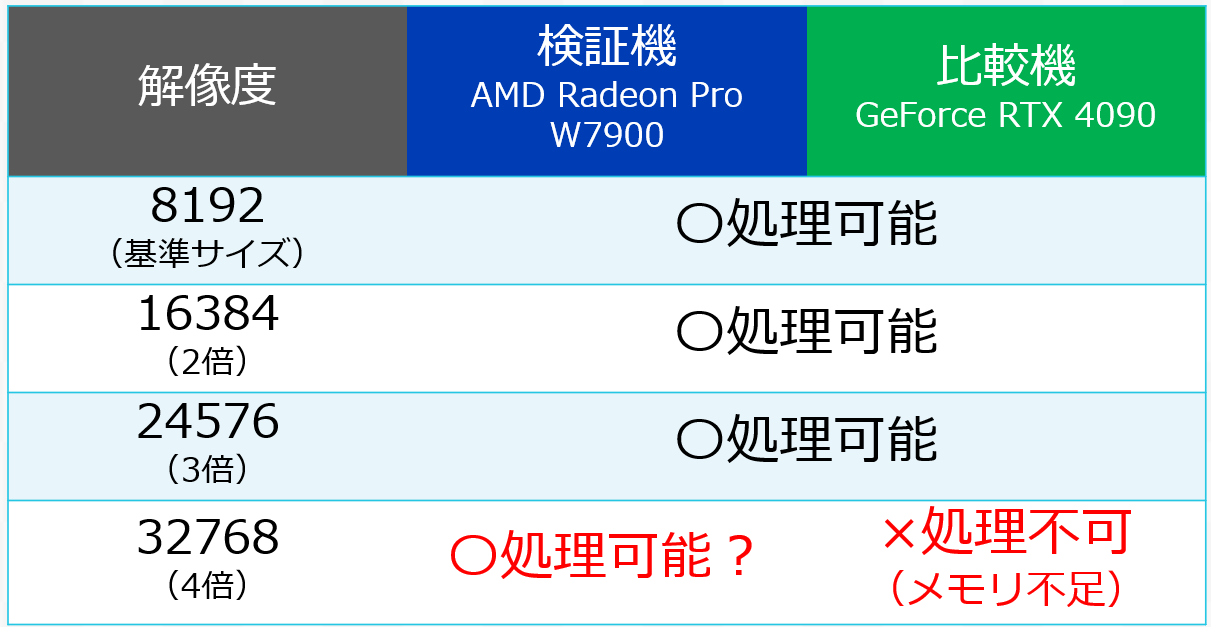 阿部:しかし、次の「対応可能な最大サイズ」の検証で決定的な差が出ました。解像度を基準(8,192)の2倍(16,384)、3倍(24,576)と引き上げて4倍(32,768)にした途端、RTX 4090は「メモリ不足」で処理が停止してしまったんです。