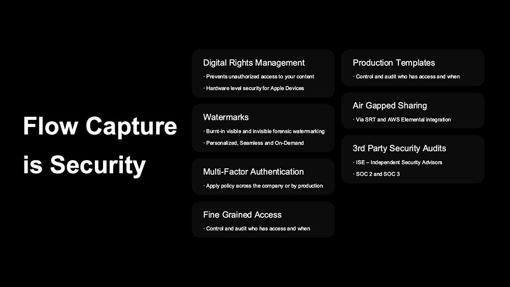 Flow Captureは、映画やゲームの制作に注ぎ込まれる計り知れない努力を踏まえて、製品レベルでデジタルライツマネジメントを標準搭載。セキュリティに徹底的にこだわっている。このセキュリティはApple、FireTV、ブラウザなど様々なプラットフォームで展開されており、今後Androidにも対応する予定だ。「セキュリティがなければ、それ以外の機能性は全く無意味だと思います」(カルベリー氏)。